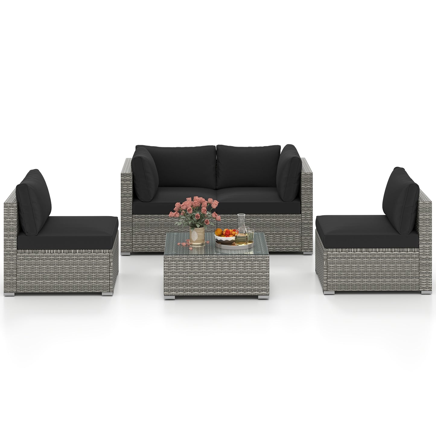 5-Piece Patio Sectional Sofa, Glass Coffee Table, Black
