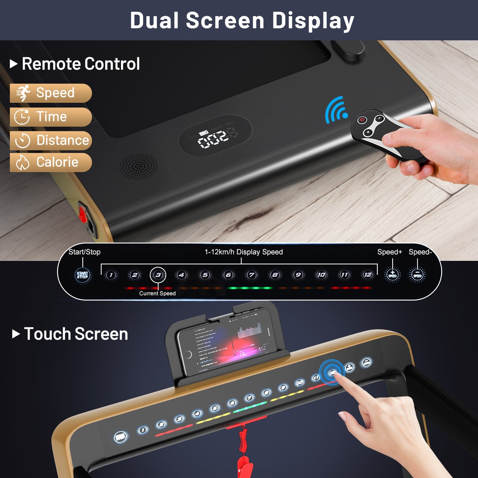 • Dual display screen with touchscreen and LED display to track distance, speed, time, and calories in real-time, featuring a colorful line flashing for a cool-running experience.
