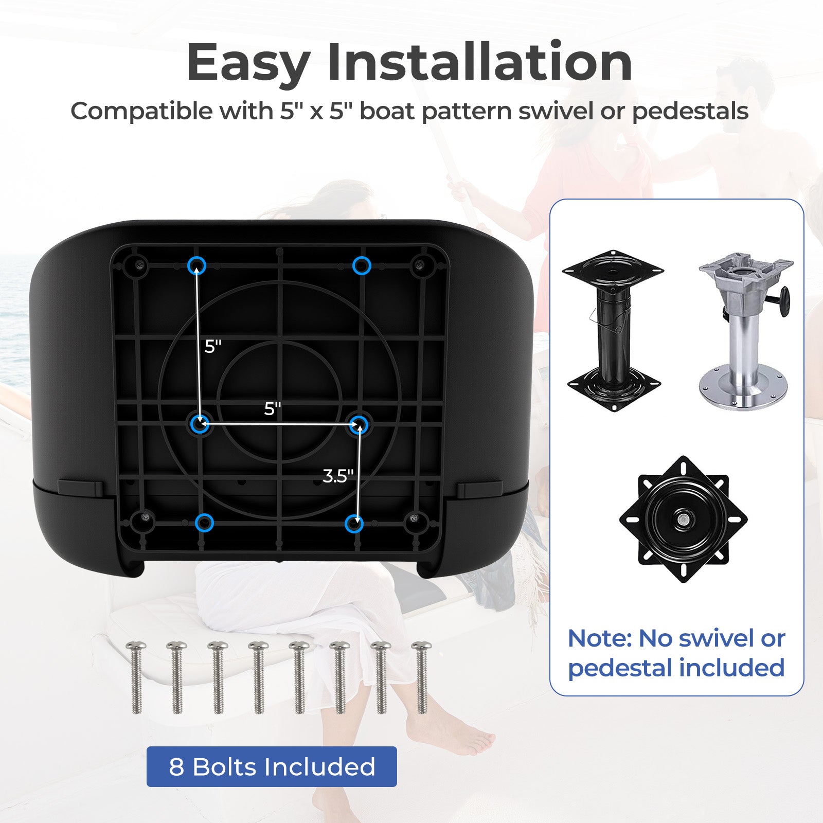 Easy Installation: Each set includes 2 boat seats and 8 fixing bolts, with only 4 bolts required per seat for installation. These seats are compatible with 5" x 5" boat pattern swivels or pedestals, enabling a fast and straightforward connection to most boat bases. (Note: No swivel or pedestal included.)