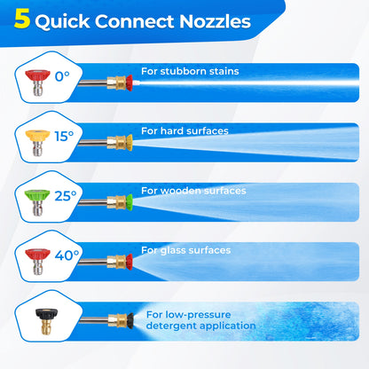 5 Nozzles and Soap Bottle: Equipped with 5 quick-connect nozzles and a soap bottle, this high-pressure power washer is adaptable for any cleaning job. From gentle cleaning to tough stains, the unit provides the right spray for all surfaces.
