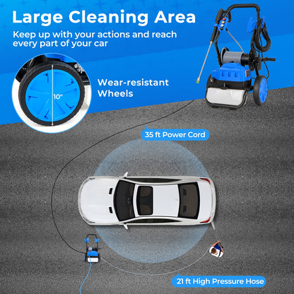 Follow Along Design: The cleaning machine features a 21 ft high pressure hose and a 35 ft power cord for effortless navigation around large vehicles or extensive areas. With 2 wear-resistant wheels and portable handle, this power washer is easy to move around while cleaning.