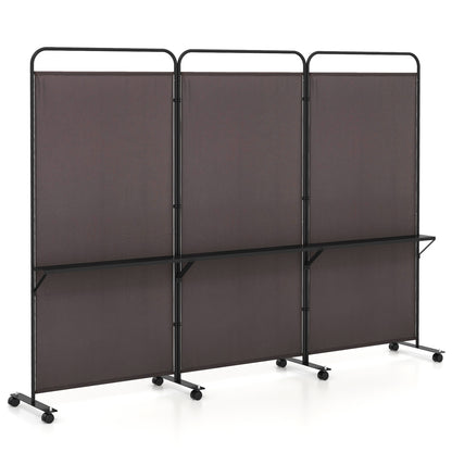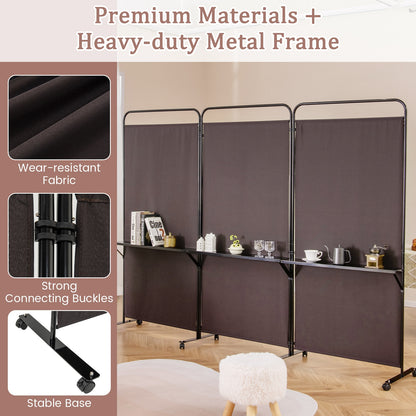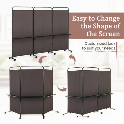 Séparateur de pièce pliable 3 panneaux, 3 étagères métalliques, roues verrouillables, marron