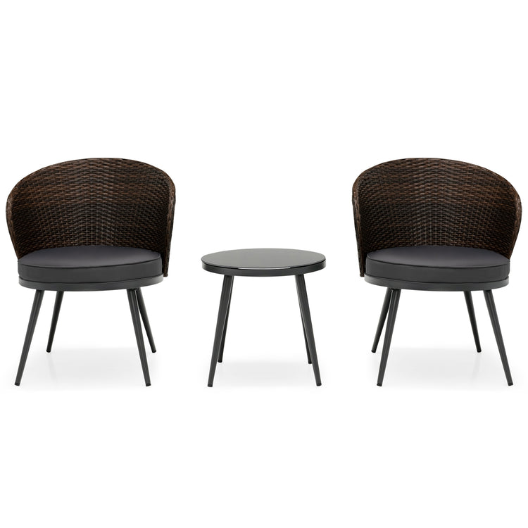 Ensemble bistro de patio en rotin 3 pièces avec 2 coussins de siège et plateau en verre trempé, marron