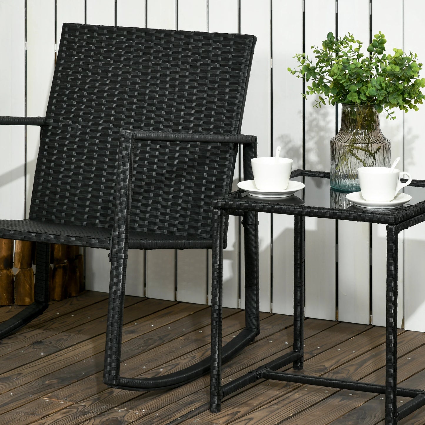 Améliorez votre détente en plein air avec cet ensemble de fauteuils à bascule élégant, comprenant deux chaises et une table assortie. Parfait pour les patios, les jardins ou au bord de la piscine, cet ensemble allie confort et durabilité grâce à son cadre en acier et son rotin PE résistant à toutes les intempéries. Profitez des après-midi paresseux avec la commodité supplémentaire d'une table à plateau en verre pour vos rafraîchissements.