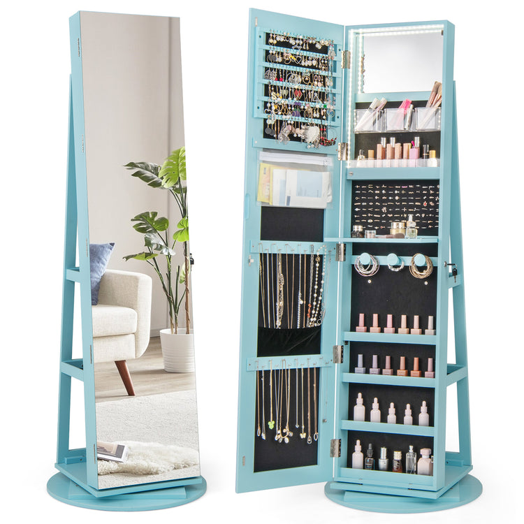 Ce meuble à bijoux autoportant avec miroir pleine longueur maximise l'efficacité de l'espace, offrant un rangement organisé étendu pour boucles d'oreilles, bagues, colliers et plus encore. Il dispose d'un éclairage LED 3 couleurs, d'un plateau de maquillage pliable, d'une base pivotante à 360° et de portes verrouillables pour une organisation sécurisée et élégante.