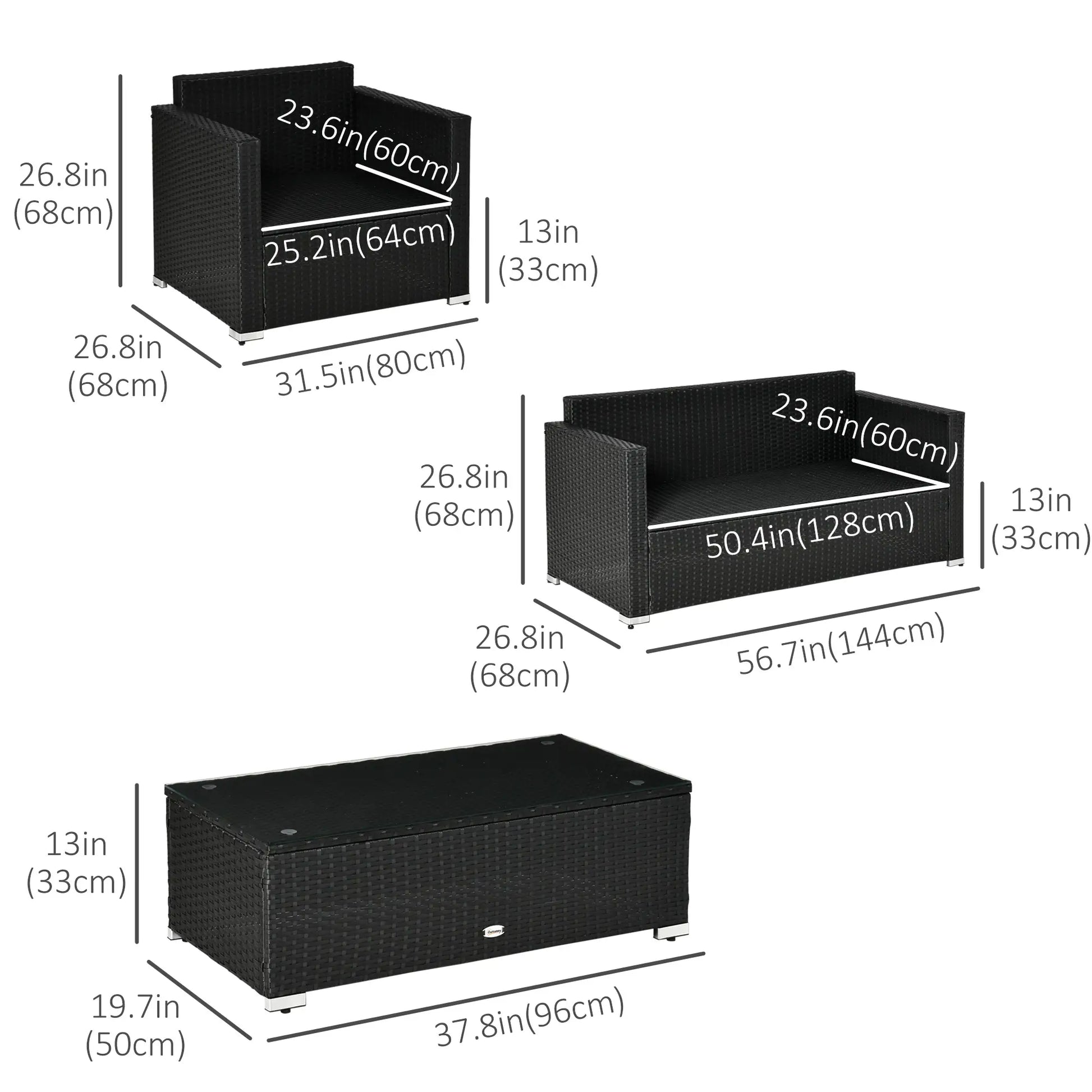 - L'ensemble de 4 pièces comprend un canapé d'amour, deux fauteuils simples et une table basse pour un siège extérieur polyvalent.