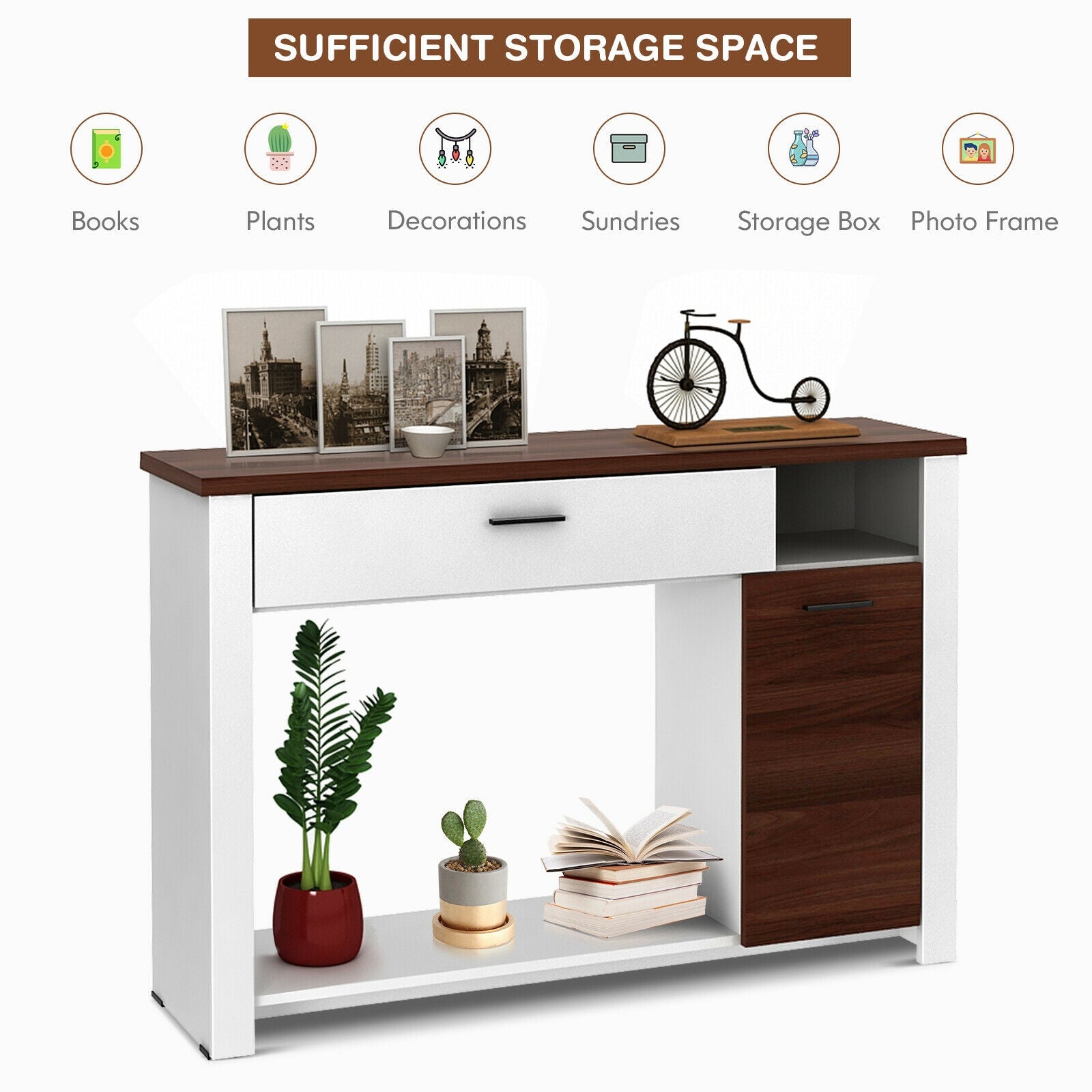 Table console de 48 pouces avec tiroir et armoire, marron et blanc