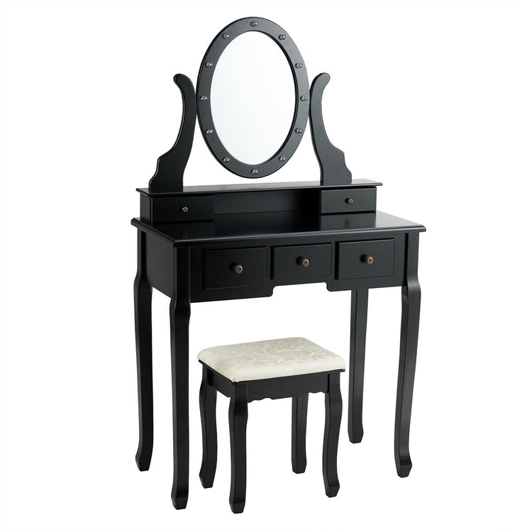 5 Drawers Vanity Table Stool Set with 12-LED Bulbs, Black