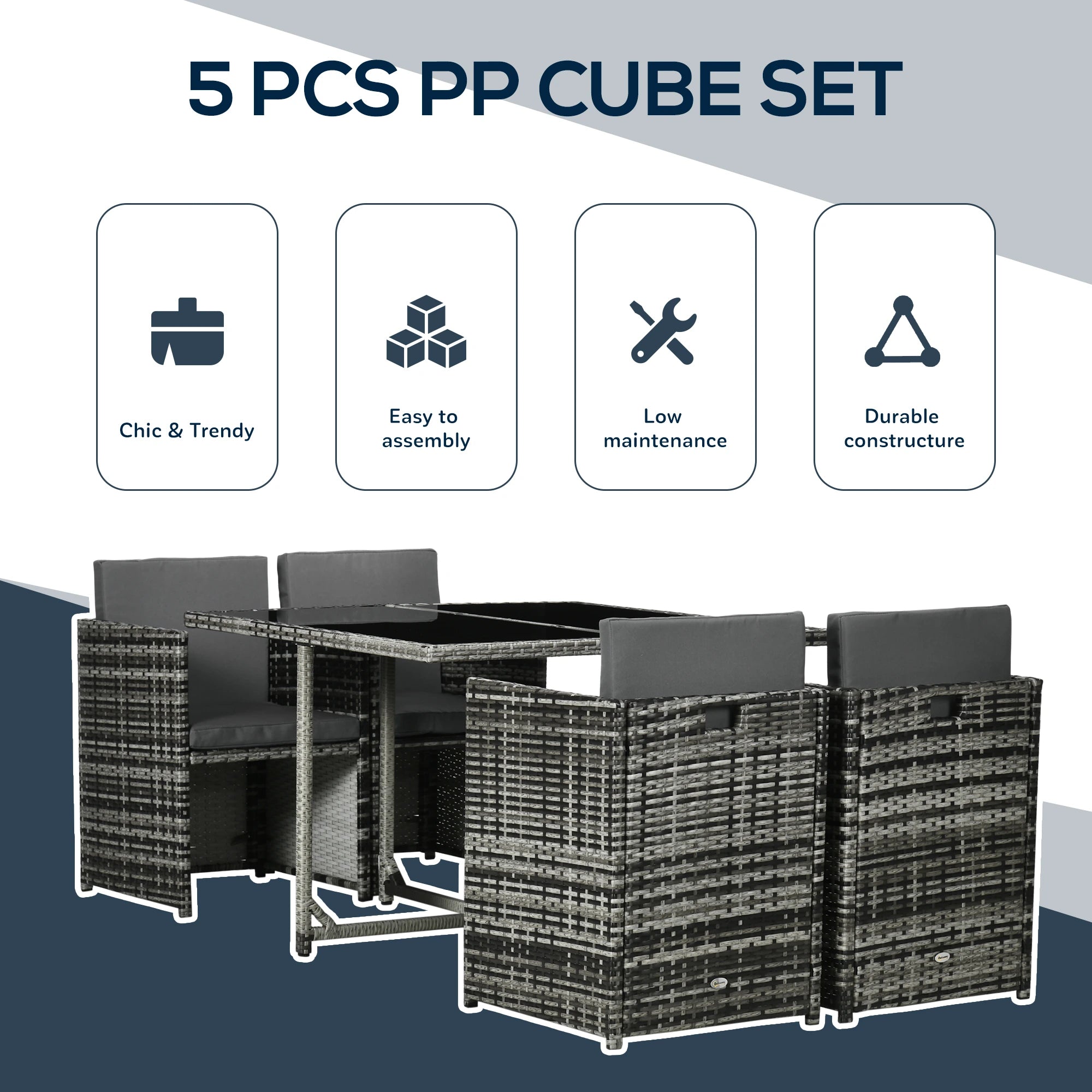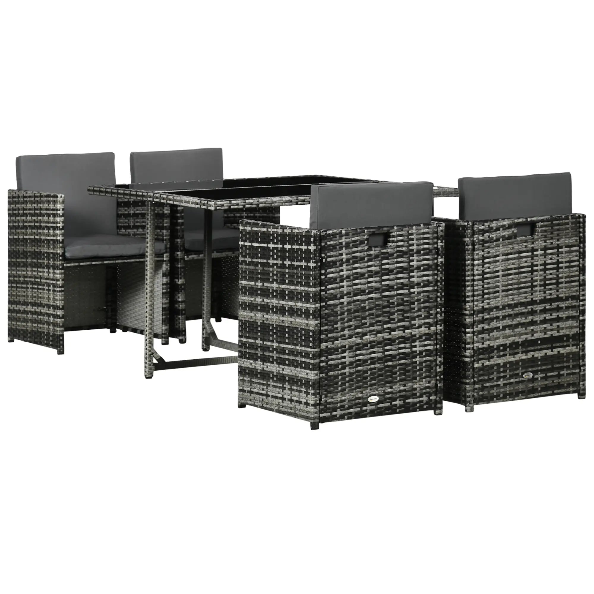 Ensemble de salle à manger en osier 5 pièces, coussins amovibles, table en verre, gris