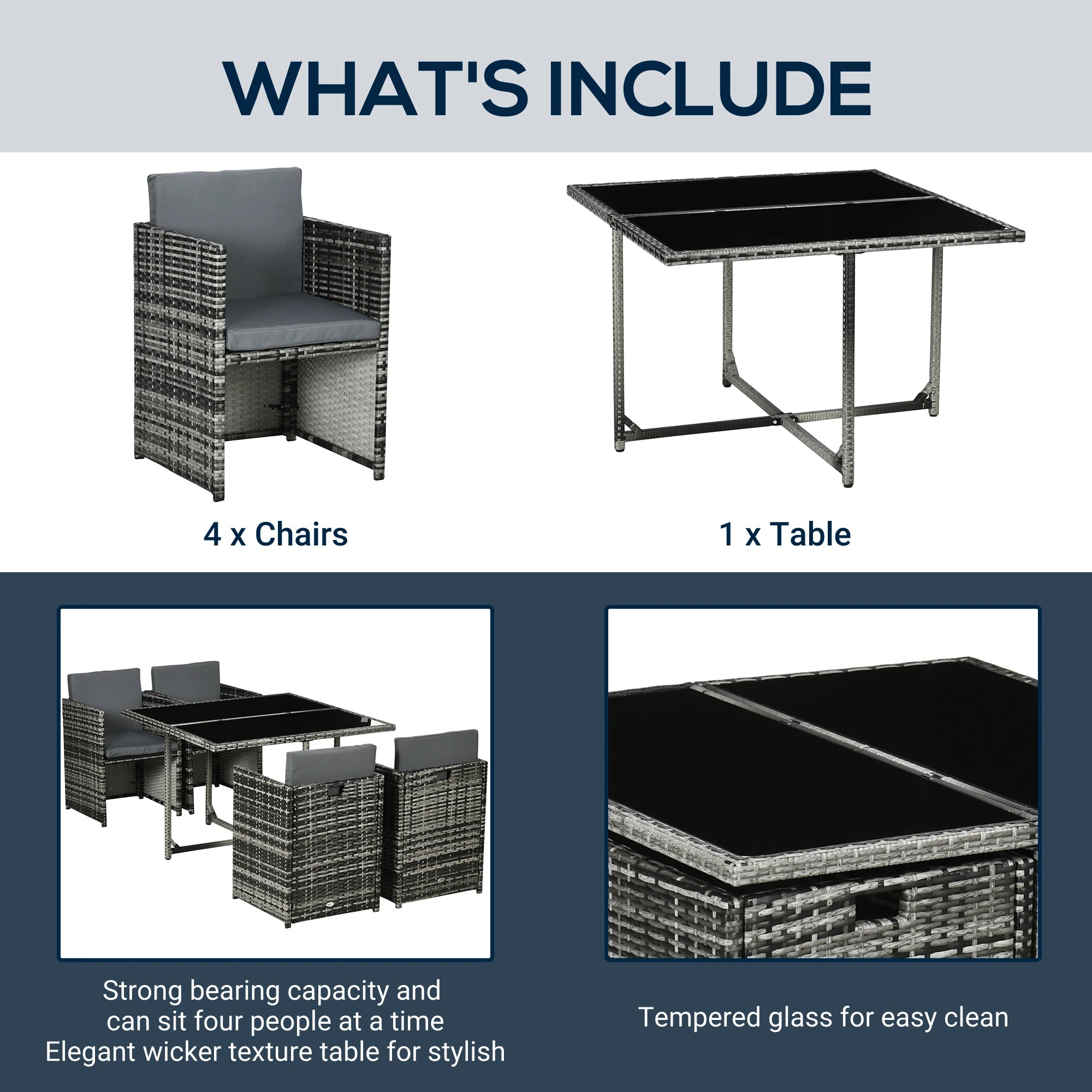 Transformez votre espace extérieur avec cet élégant ensemble de salle à manger en rotin de 5 pièces, parfait pour les jardins, les patios, les piscines et les terrasses. Doté d'un cadre en acier robuste et de rotin PE toutes saisons, cet ensemble allie durabilité et style. Comprend 1 table et 4 chaises avec rangement caché pour un gain de place pratique.