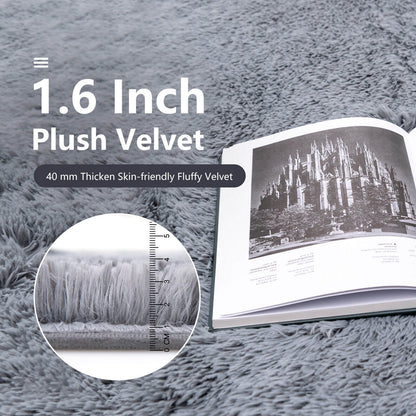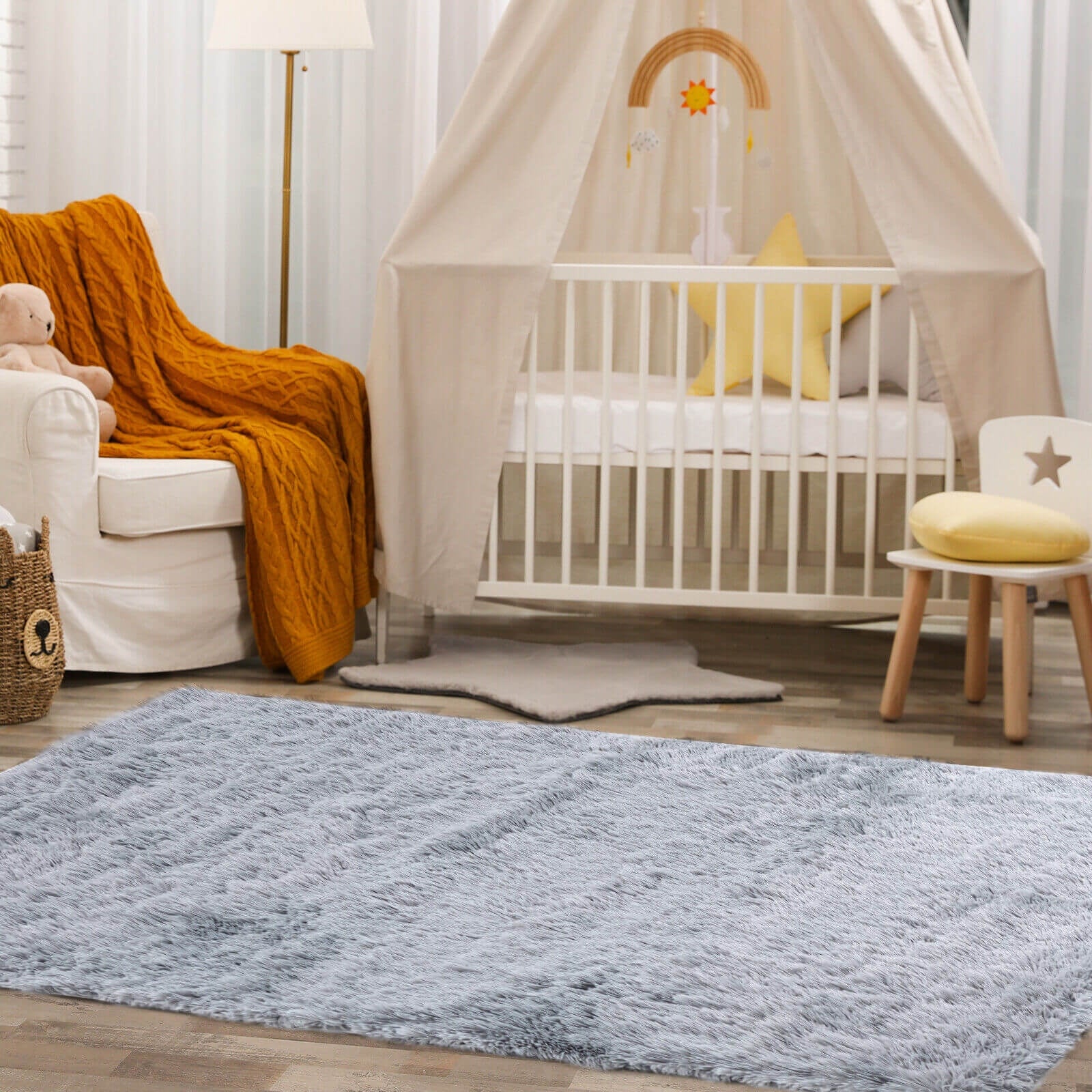 - Plush, high-pile shag rug with elegant light gray color for versatile home decor
