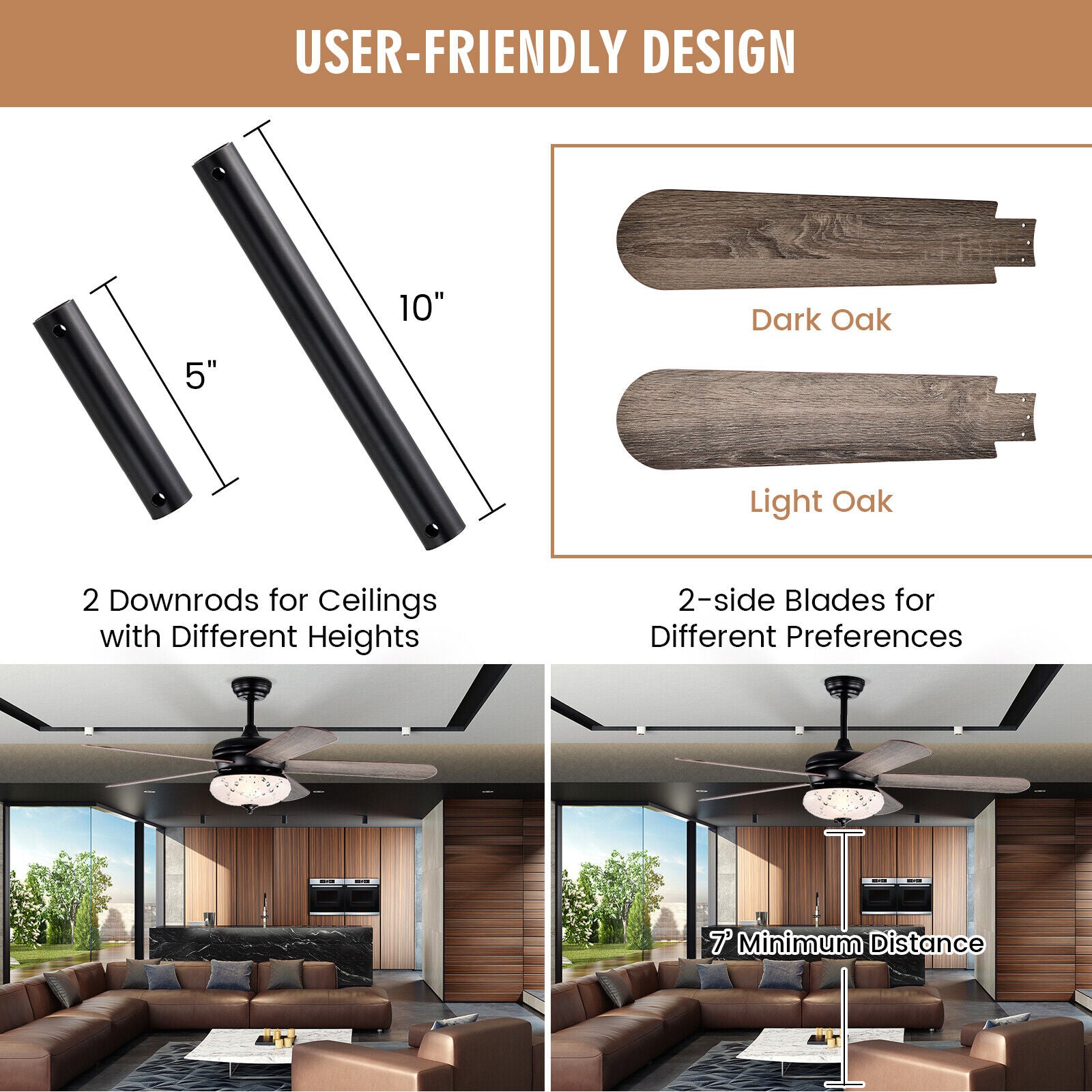 ● Options de montage : ce ventilateur de plafond de qualité offre 2 options de montage. En fonction des différents types de plafonds, ce ventilateur de plafond peut être suspendu à une tige ou incliné (≤ 30°). Et les 2 tiges de suspension (5"/10") sont incluses, ce qui rend ce ventilateur de plafond adapté aux plafonds de différentes hauteurs.