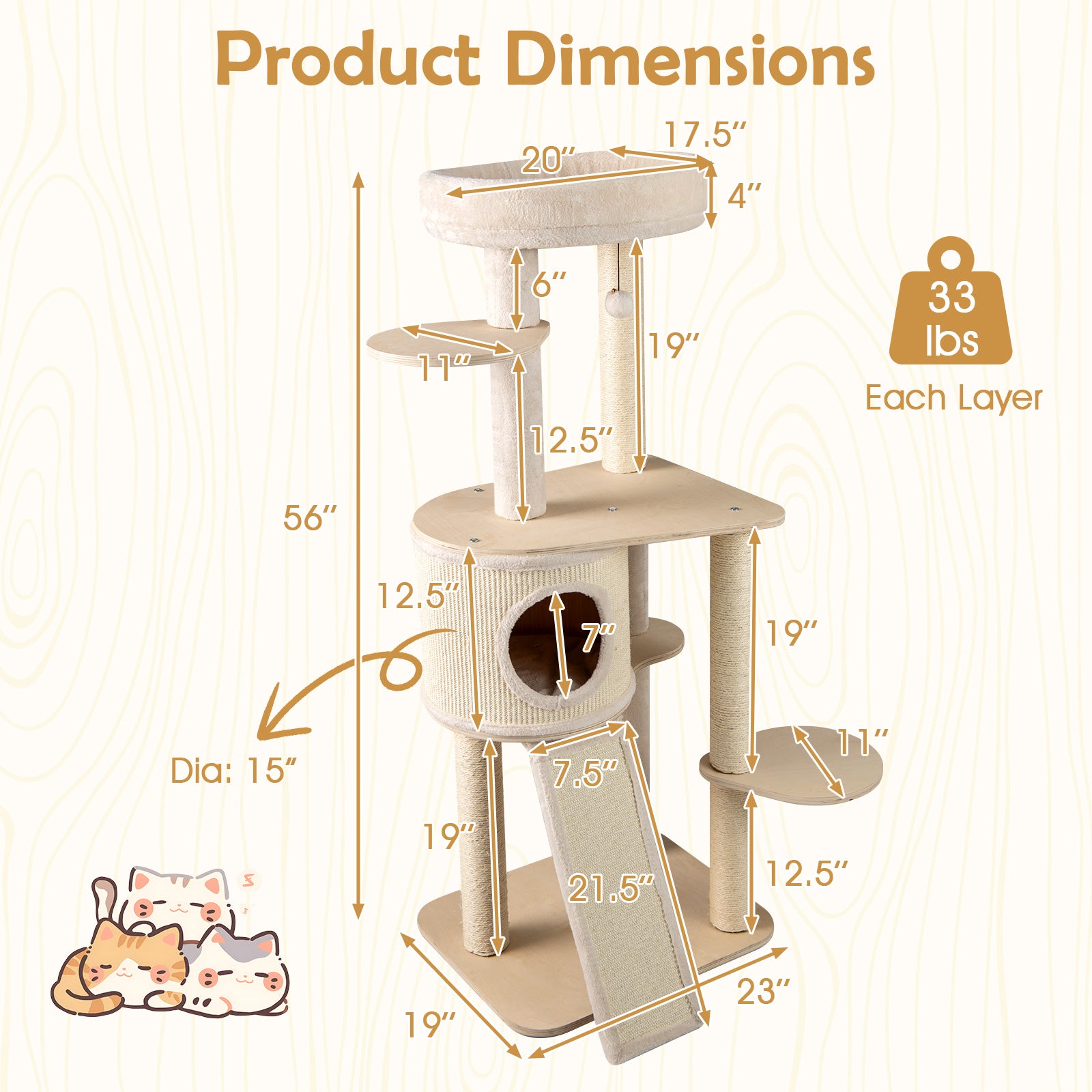 56 Inch Tall Cat Tree with 2 Sisal Scratching Posts and Ladder-NA, Natural