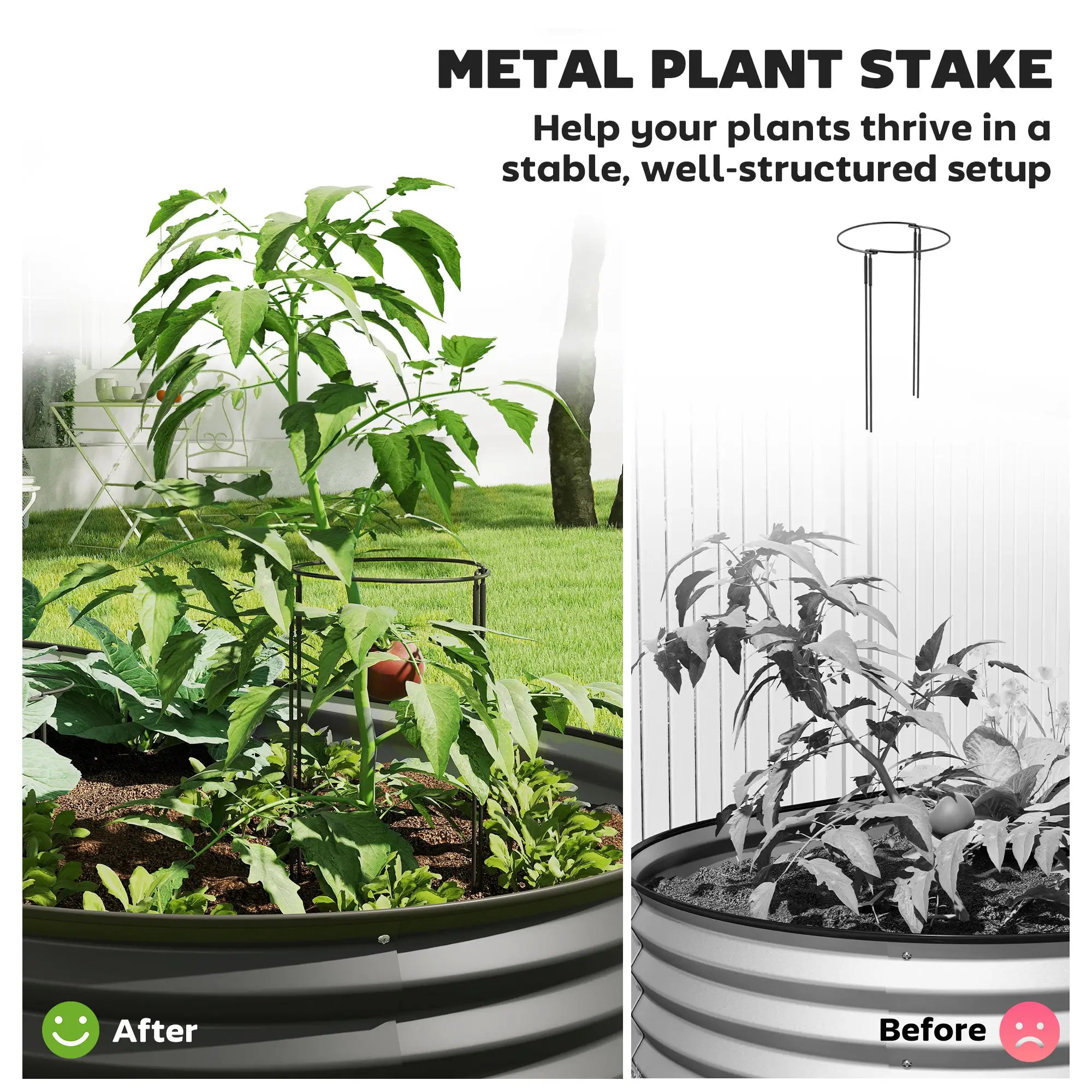 - Tuteur métallique de soutien : Comprend un tuteur métallique pour soutenir la croissance prospère de vos plantes dans le bac galvanisé