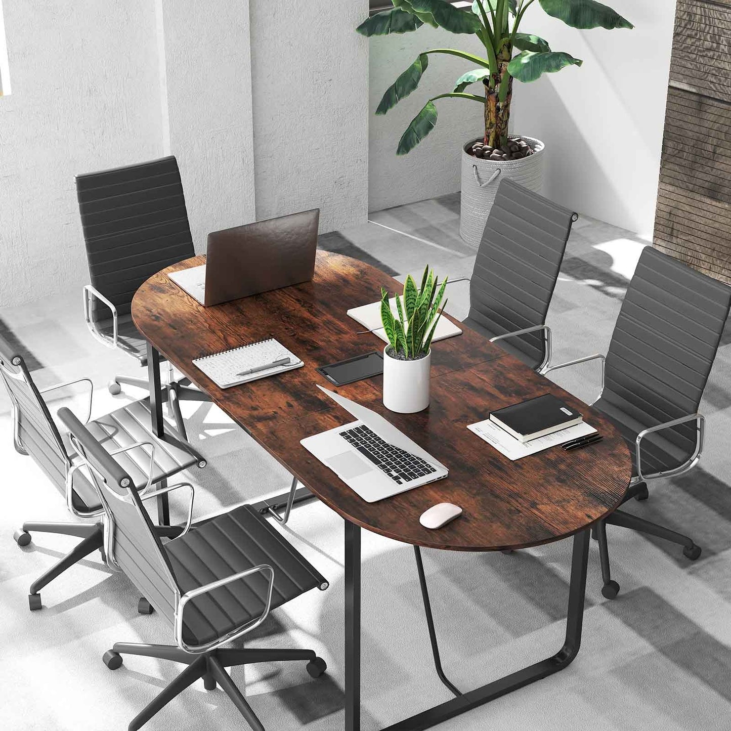 - Eye-catching oval shape with rustic brown finish enhances office aesthetics.