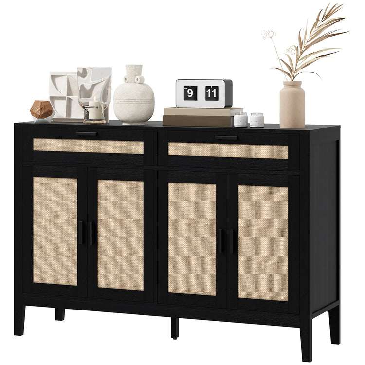 Améliorez votre maison avec ce buffet polyvalent, alliant l'élégance Boho à un rangement fonctionnel. Idéal pour les salons, les salles à manger ou les cuisines, il dispose de 2 tiroirs et de deux armoires à deux niveaux pour un rangement organisé. Ses façades en rotin ajoutent une touche chic, tandis que les sangles anti-basculement assurent la sécurité. Parfait comme support TV ou buffet, cette pièce allie style et praticité.