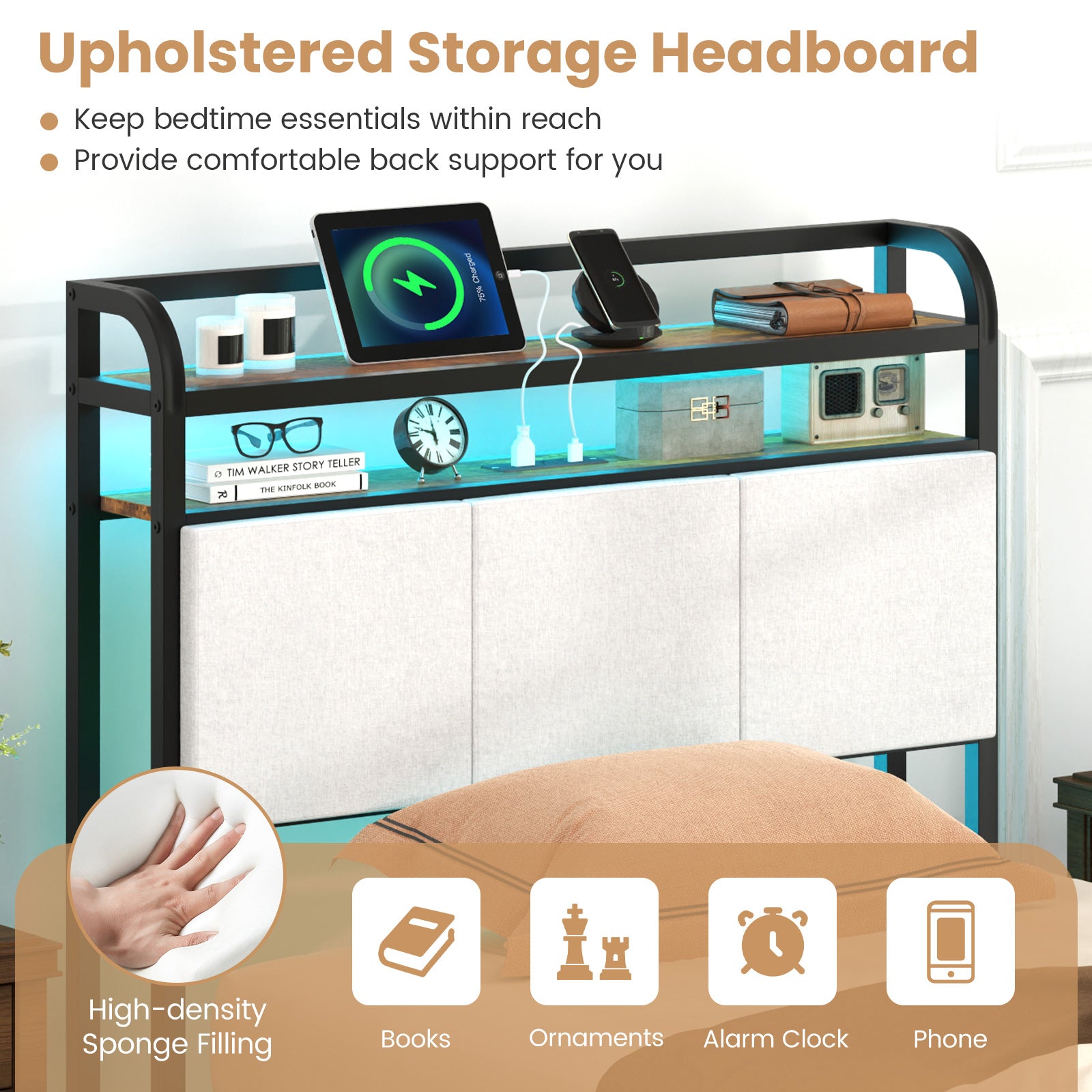 - Tête de lit de rangement à 2 niveaux pour livres, ornements, réveil et téléphone