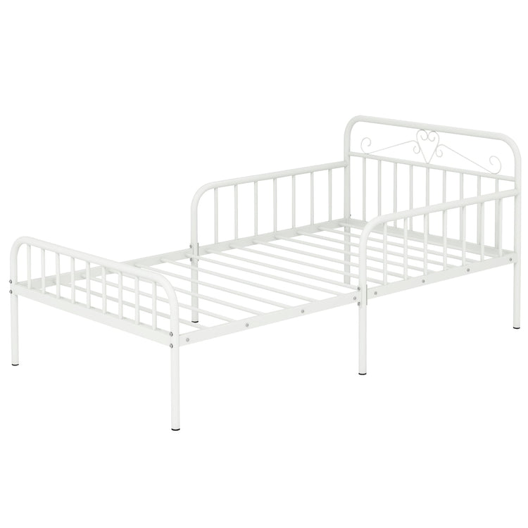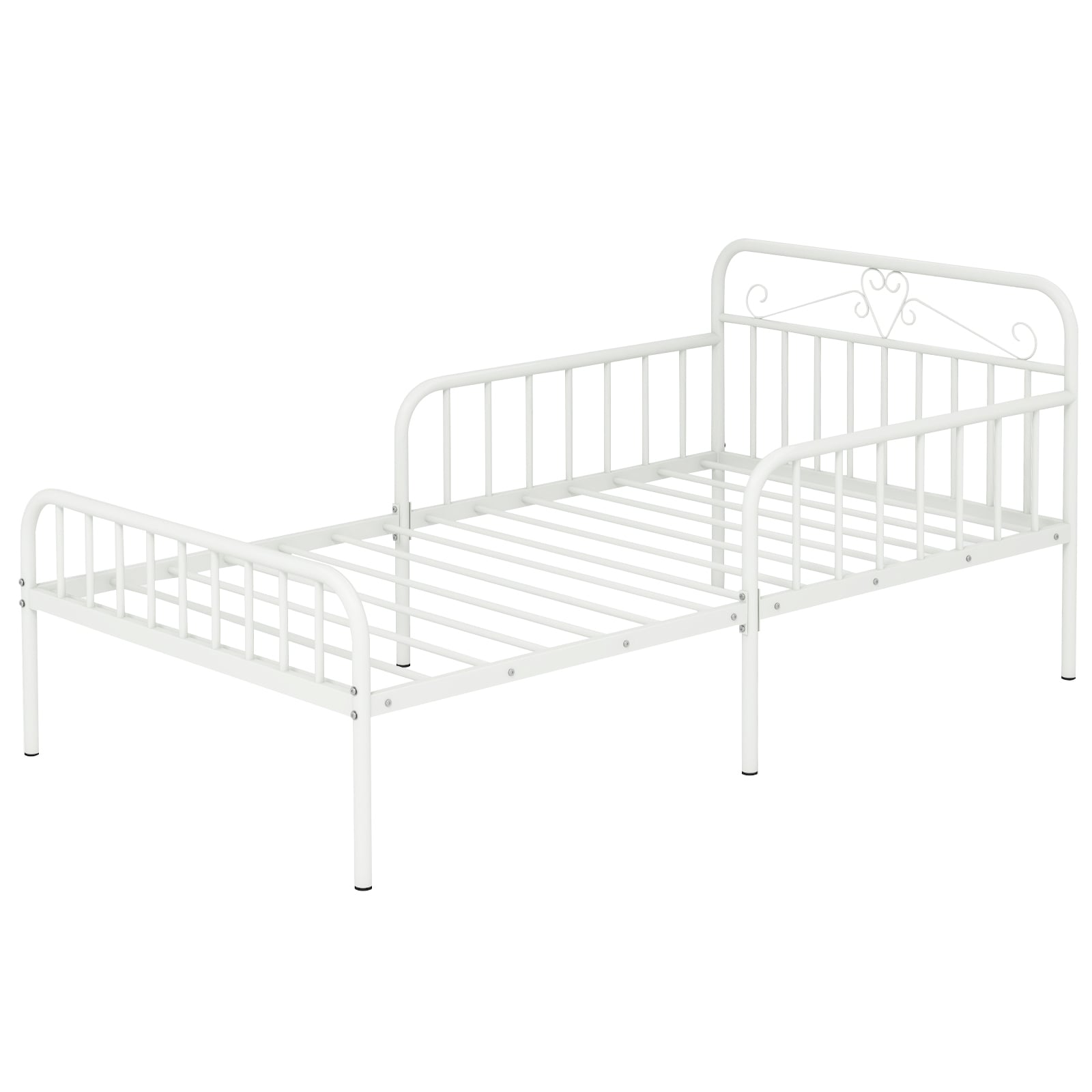 Découvrez un lit jumeau élégant et sécurisé avec une tête de lit élégante, des barrières de sécurité et un grand espace de rangement sous le lit. Ce cadre de lit en métal durable offre une capacité de charge de 485 lbs, 6 pieds de support pour la stabilité et une plateforme à lattes qui élimine le besoin d'un sommier, ce qui en fait une pièce maîtresse parfaite pour toute chambre à coucher.