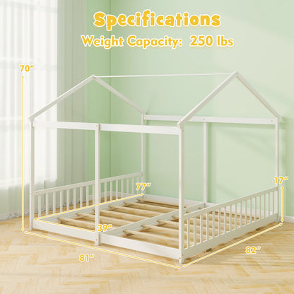 Double Floor Bed for Twins House Beds with Safety Guardrails for 2 Kids, White