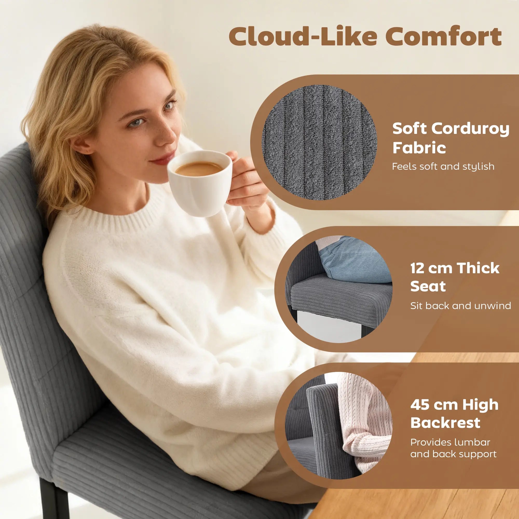 - Matériau : Tissu en velours côtelé (100% polyester), remplissage en mousse, contreplaqué, pieds en bois d'hévéa.