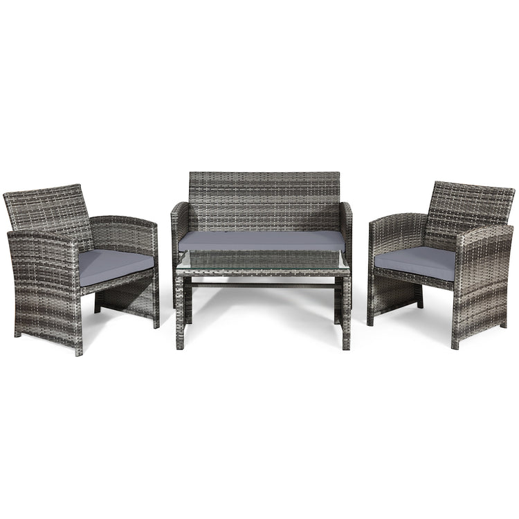 Ensemble de patio en rotin 4 pièces, table en verre, canapé deux places, gris