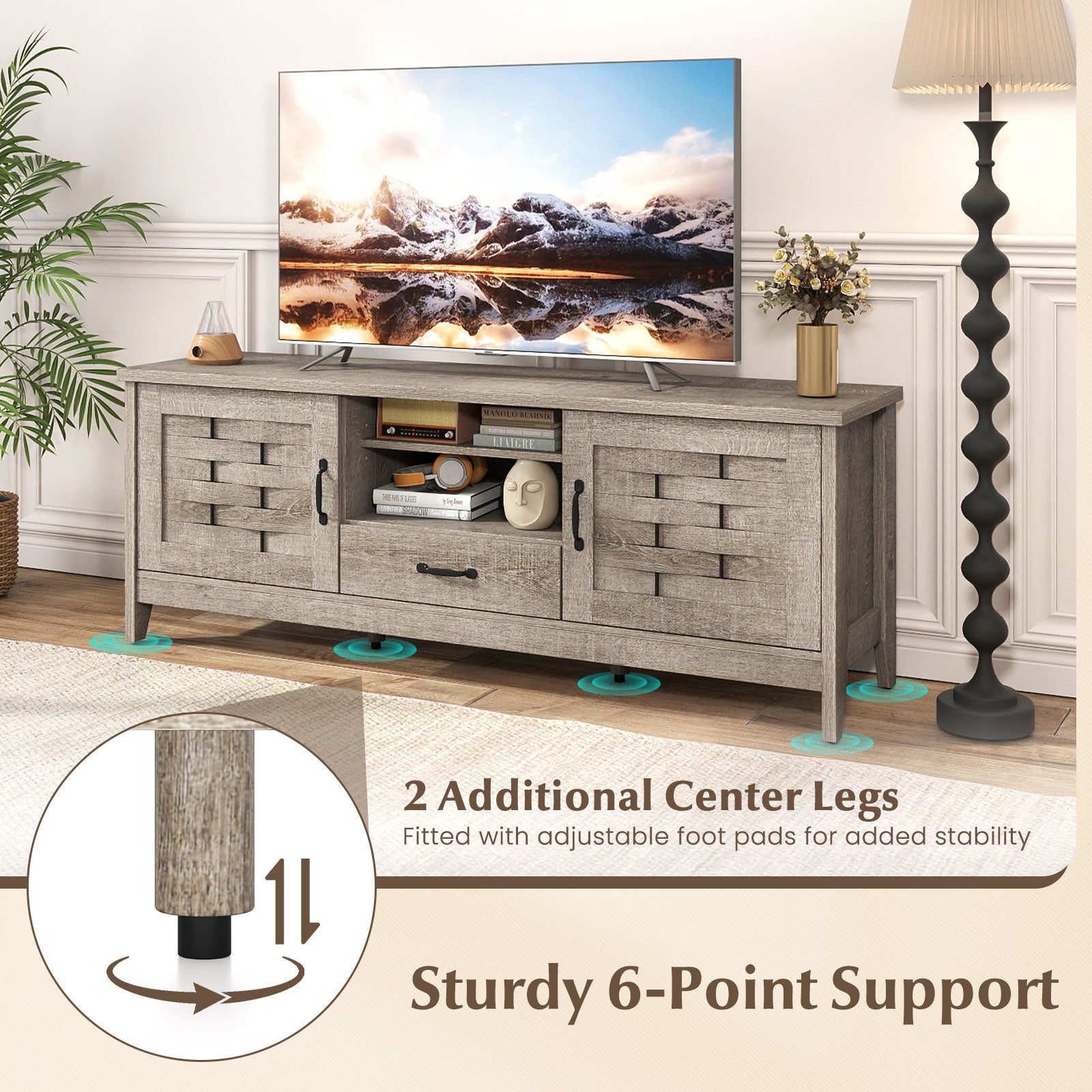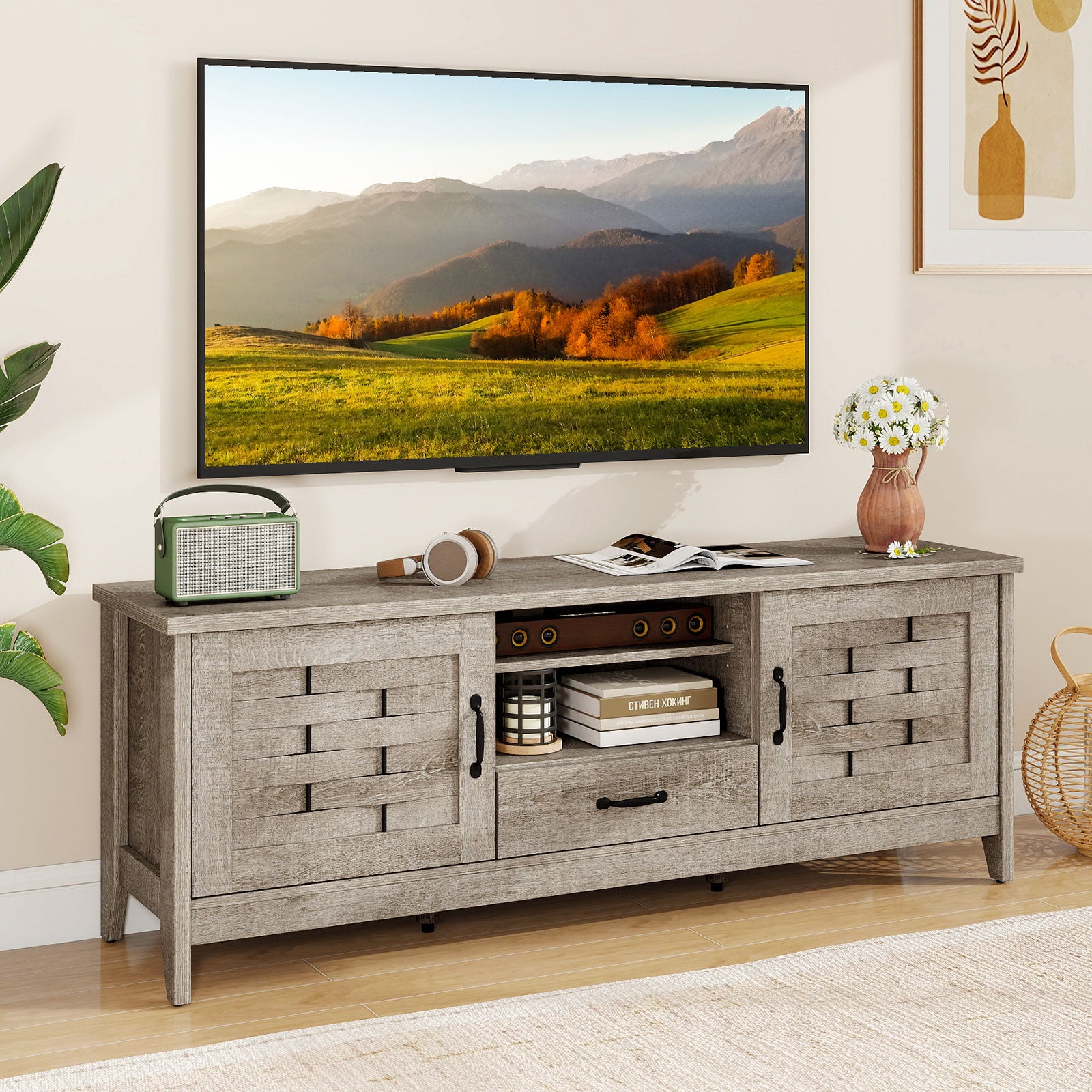 All-in-One Entertainment Hub: This TV console features a 59" spacious tabletop that accommodates TVs up to 65 inches, complete with 2 open shelves, a smooth-gliding storage drawer, and 2 side cabinets to organize game consoles and media collections. 2 built-in cable holes keep wires neatly tucked away for a clutter-free look, making this 59" entertainment center perfect for modern living spaces.Fully Customizable Storage: This farmhouse TV stand includes 3 flexible shelves that each adjust to 3 different height positions and can be completely removed for personalized storage compartments. The adaptable design allows you to perfectly house components of various sizes, transforming the rustic media console table to fit your exact needs.
