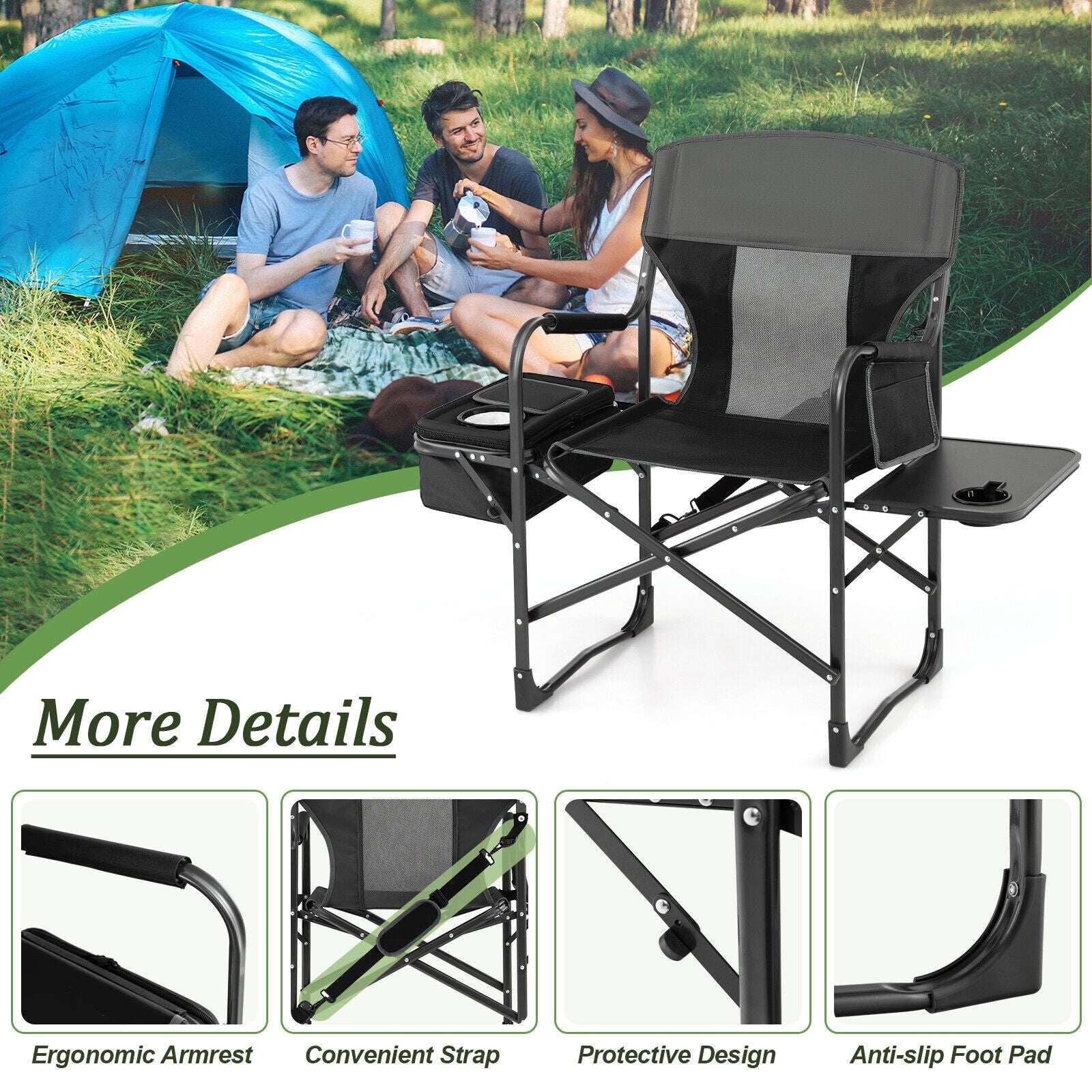 Folding Camping Director Chair With Cooler Bag, Side Table, Black