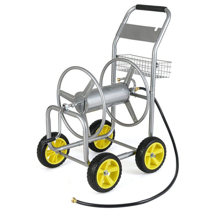 Garden Hose Reel Cart Metal Hose Cart with 4 Wheels and Storage Basket, Silver