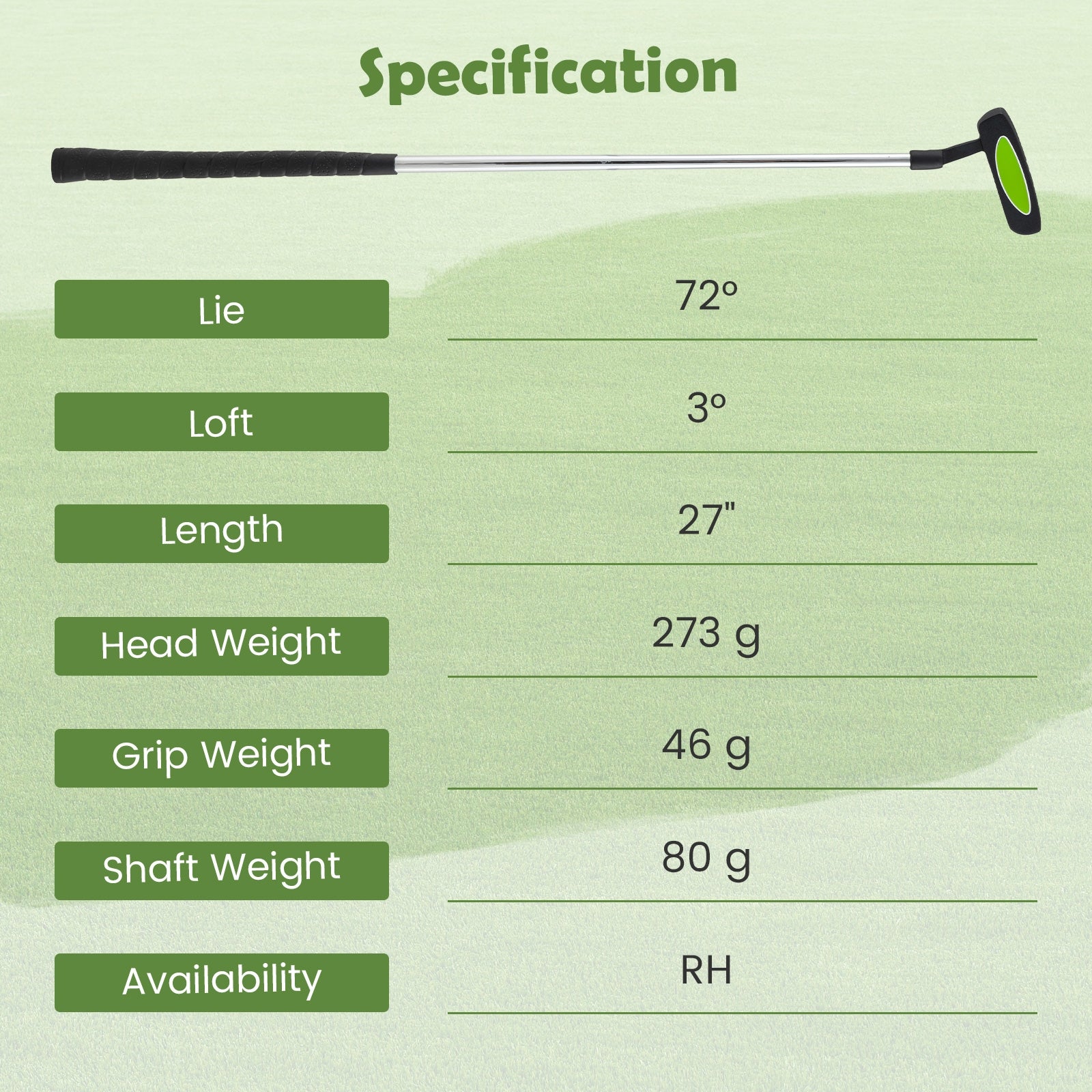 Mallet Style Putter: The mallet putter design with zinc alloy head offers exceptional stability through the stroke, and the low center of gravity helps reduce twisting on impact with the ball. Additionally, equipped with alignment lines on the club head, it aids young golfers in aligning their putts more accurately.