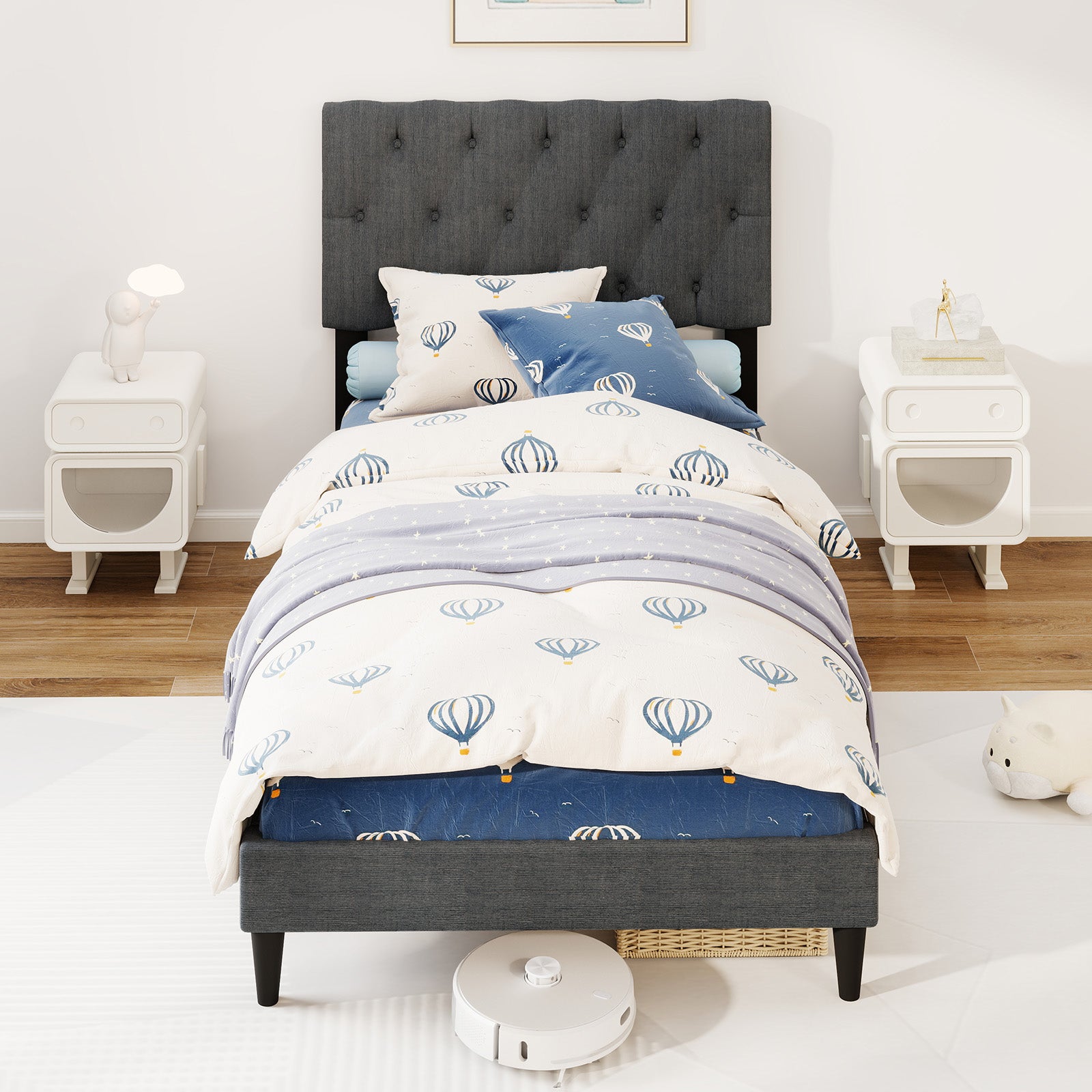 Lit à Plateforme Capitonné, Tête de Lit Capitonnée, Lattes en Bois, Taille Jumeau, Gris