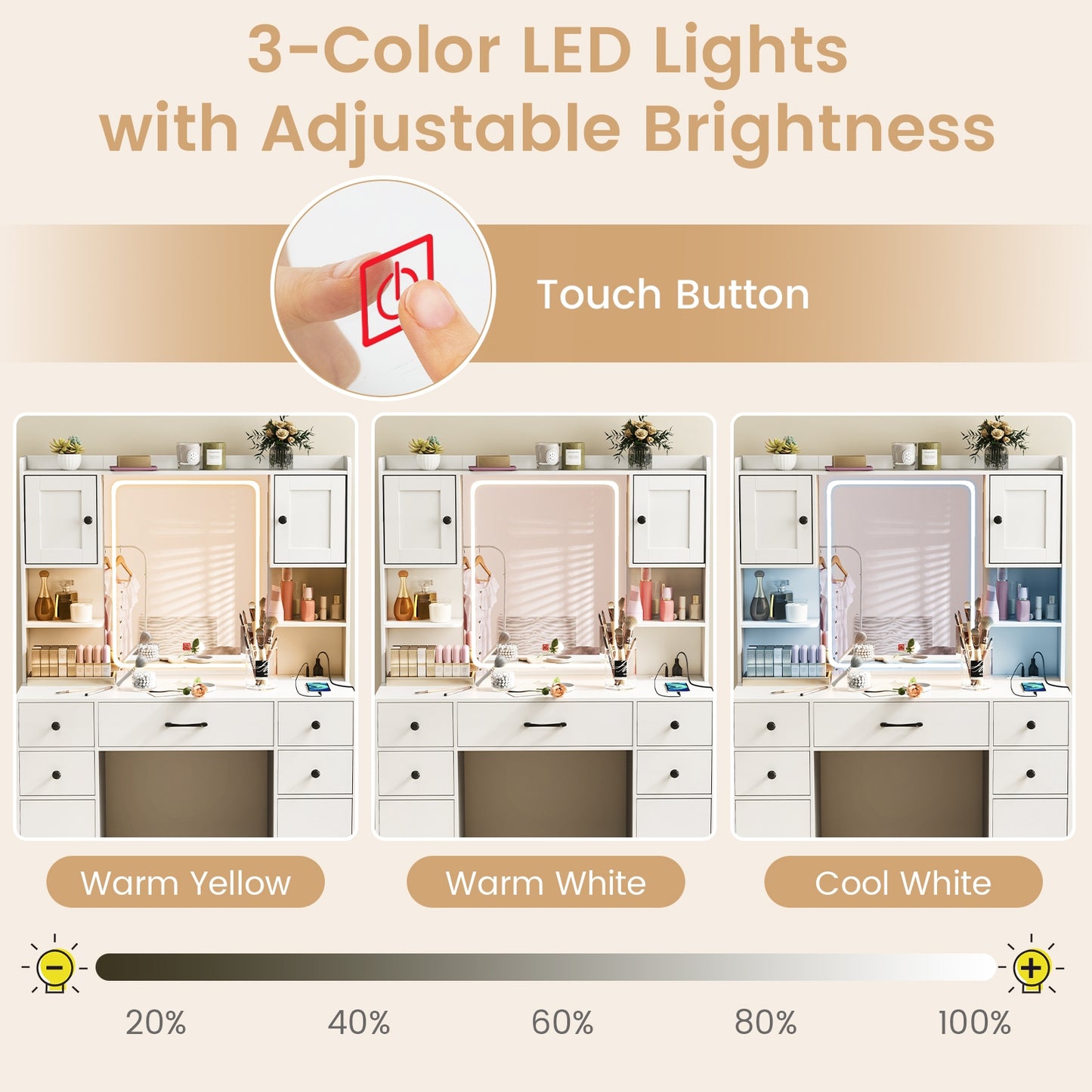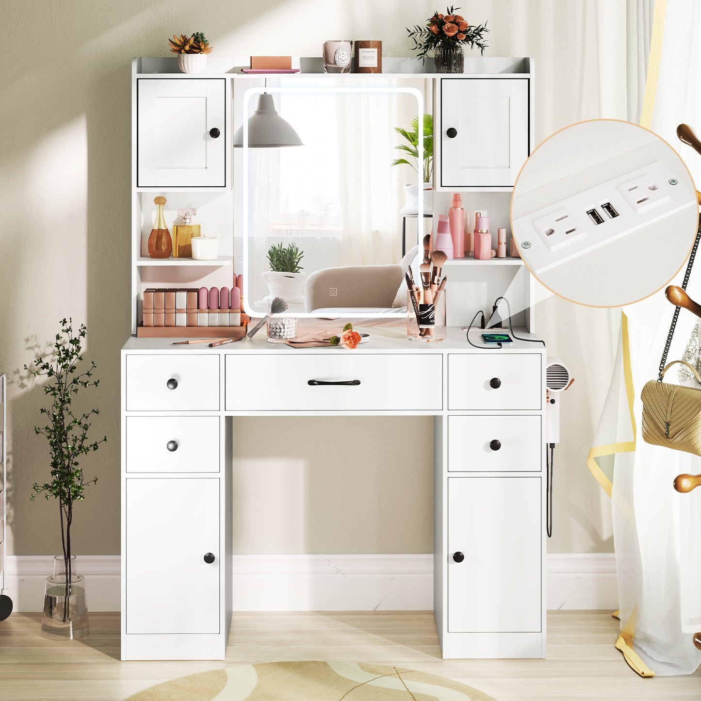 Transformez votre routine quotidienne avec cette élégante coiffeuse dotée d'un miroir LED haute définition à éclairage réglable, d'une station de charge intégrée et d'un vaste rangement. Idéale pour organiser maquillage et accessoires tout en ajoutant une touche stylée à toute chambre ou espace d'habillage.
