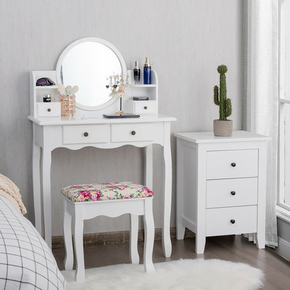 Avec 4 tiroirs de tailles différentes, il est pratique de ranger vos bijoux et ornements. Et sur la table spacieuse, vous pouvez placer des produits cosmétiques et des outils de maquillage pour les emporter facilement. En outre, les hauts déflecteurs sur le dessus de table peuvent empêcher les objets de tomber de la commode. Il existe également un tabouret rembourré avec un coussin plus épais assorti à la commode afin que vous puissiez vous asseoir confortablement lorsque vous vous maquillez. Conçu avec un style moderne et concis, cet ensemble de commode sera un décor parfait dans votre maison.