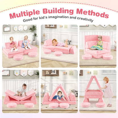 Multiple Building Methods: The kids foam couch features 2 foldable cushions, 2 round cushions, and 2 trapezium blocks for flexible combination. The play couch can be converted into kid's chairs, beds, crawling tunnels, climbing toys, and more, which is good for kid's imagination and creativity.