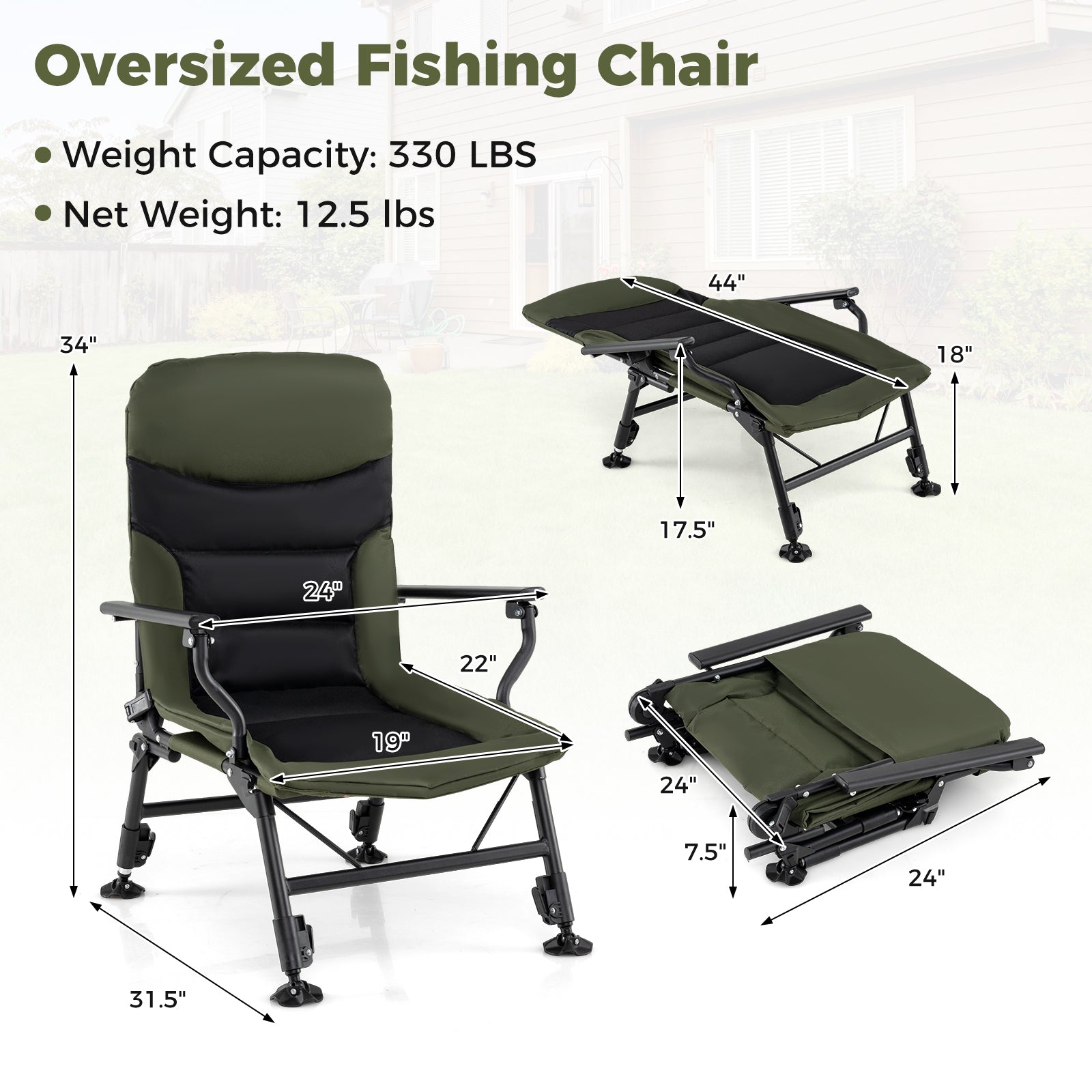 Oversized Foldable Fishing Chair for Adults with Armrest, Green