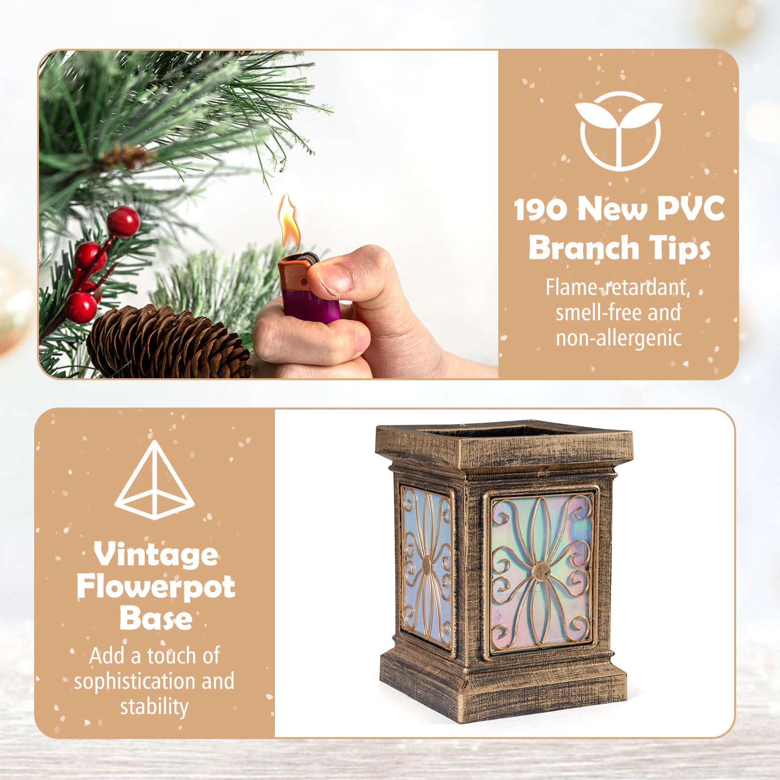 Premium Safe Materials: Crafted from new PVC, the potted Christmas tree ensures lasting beauty throughout the holiday season. Engineered to be anti-fading, fireproof, non-allergic, and smell-free, it promises a safe addition to your festivities.