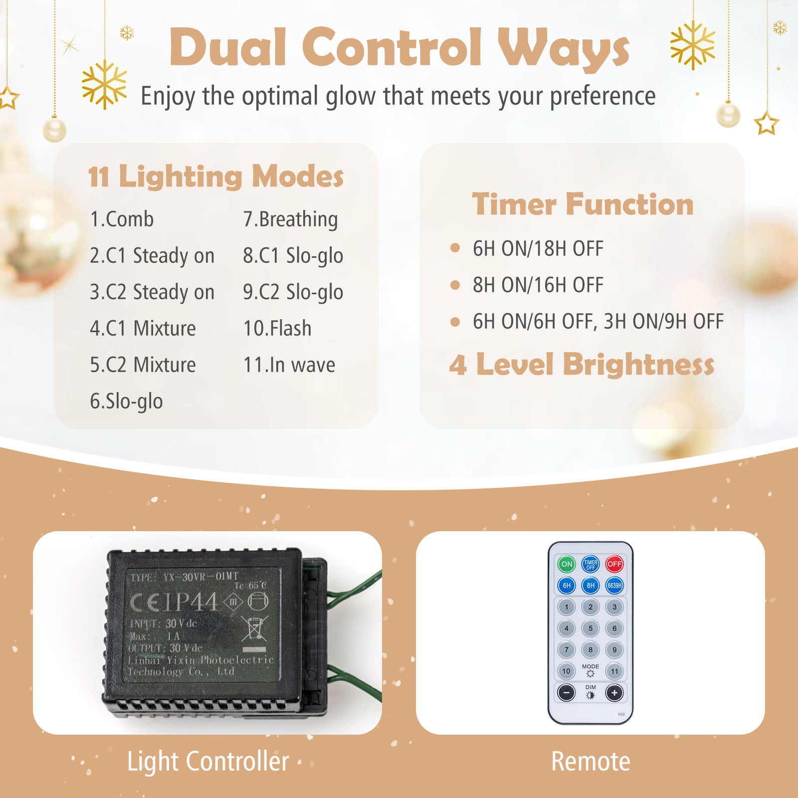 Advanced Lighting Options: Effortlessly switch between 11 dynamic lighting modes, adjust brightness across 4 levels, and set a 3-level auto timer. With the remote and light controller, you can conveniently control these settings.