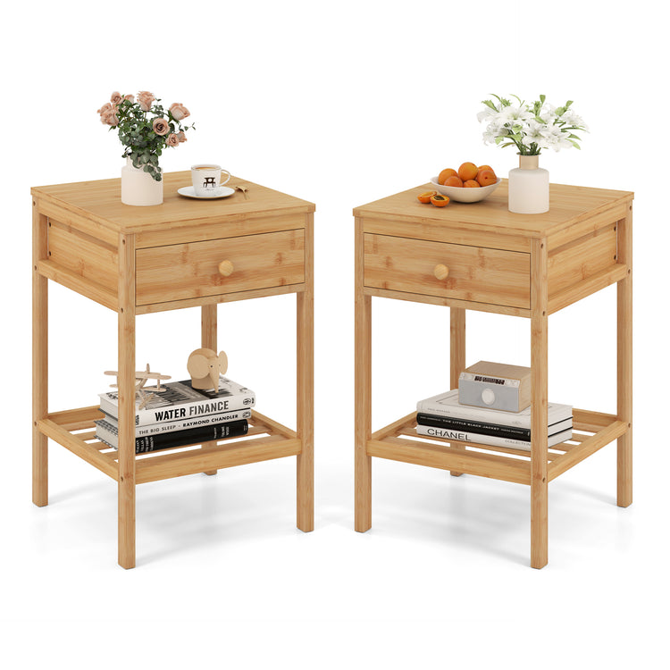Set of 1/2 Bamboo Nightstand Bedside Table with Storage Drawer and Open Shelf-2 pieces