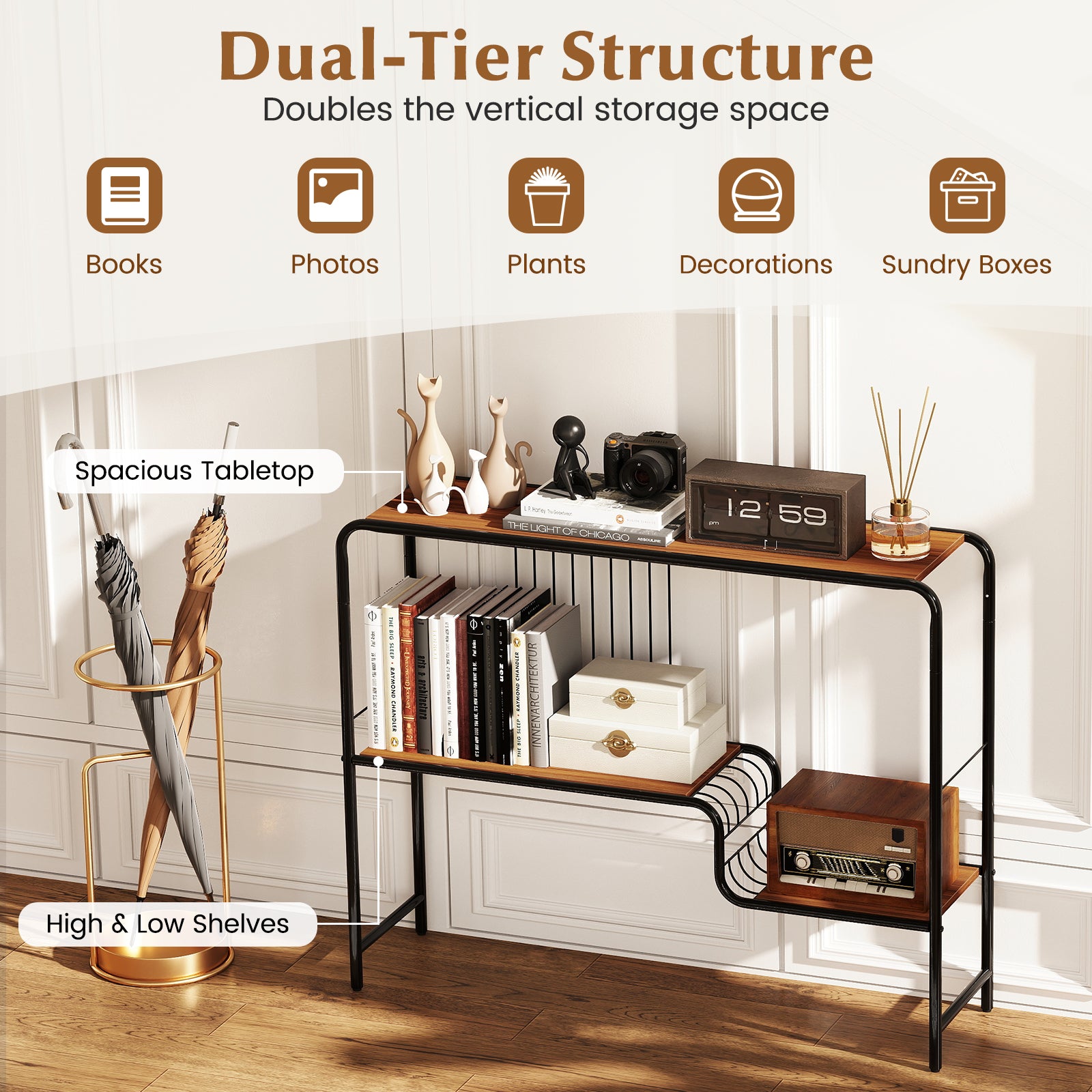 - Étagères haute et basse accueillent des objets de différentes hauteurs.