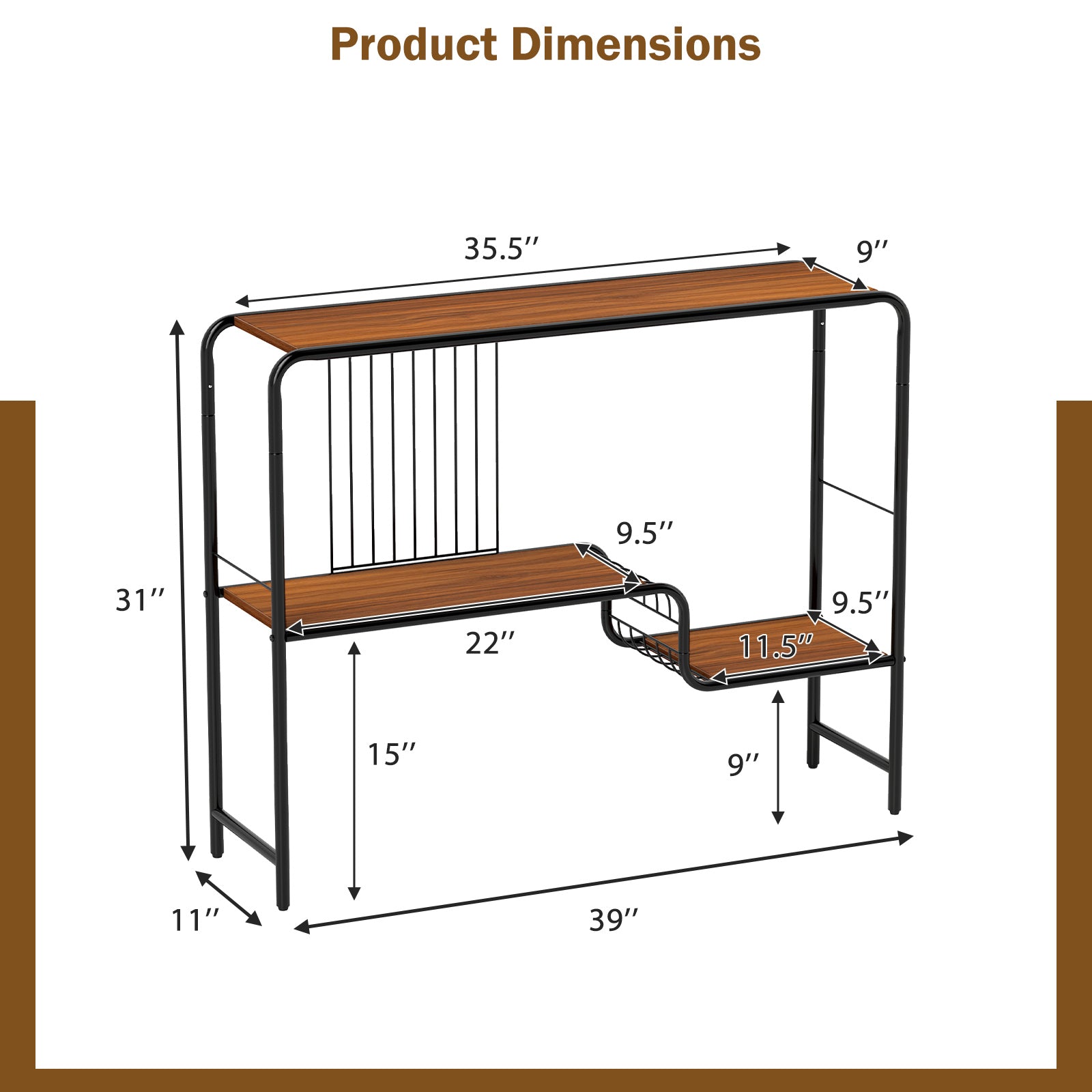 - Dimensions globales : 39" x 11" x 31" (99,06 cm x 27,94 cm x 78,74 cm).