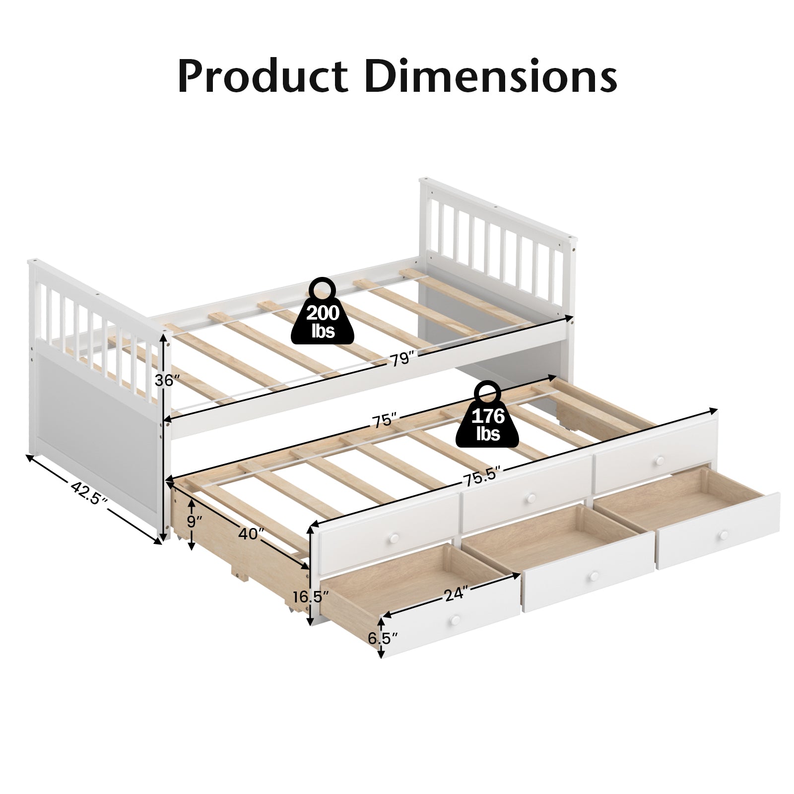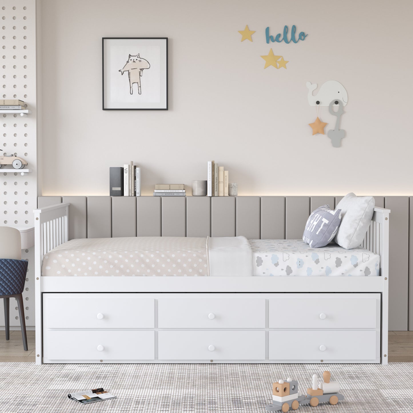 Made of high-standard solid wood, this twin size bed with trundle bed and 3 drawers is sturdy and stable enough for years of use and enjoyment.