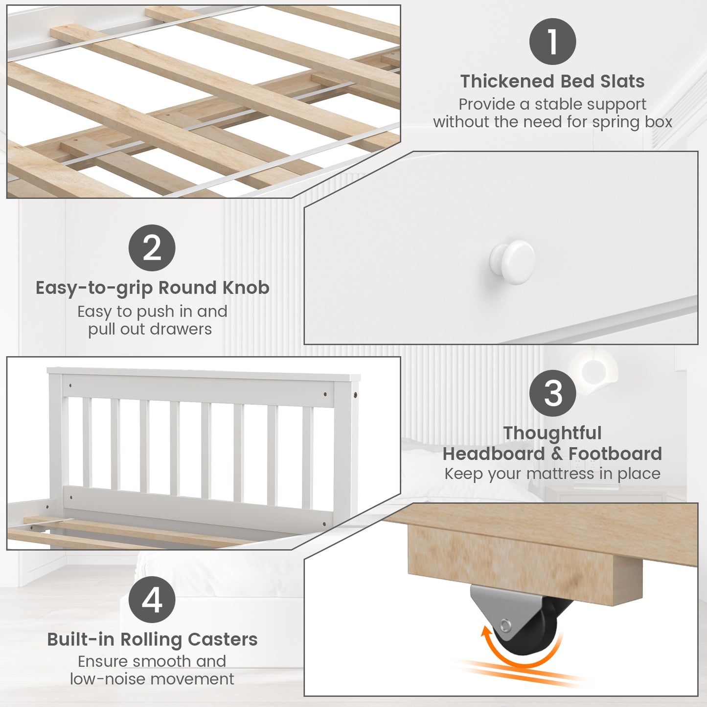 • Smooth casters at the bottom make it easy to pull out the trundle bed and drawers