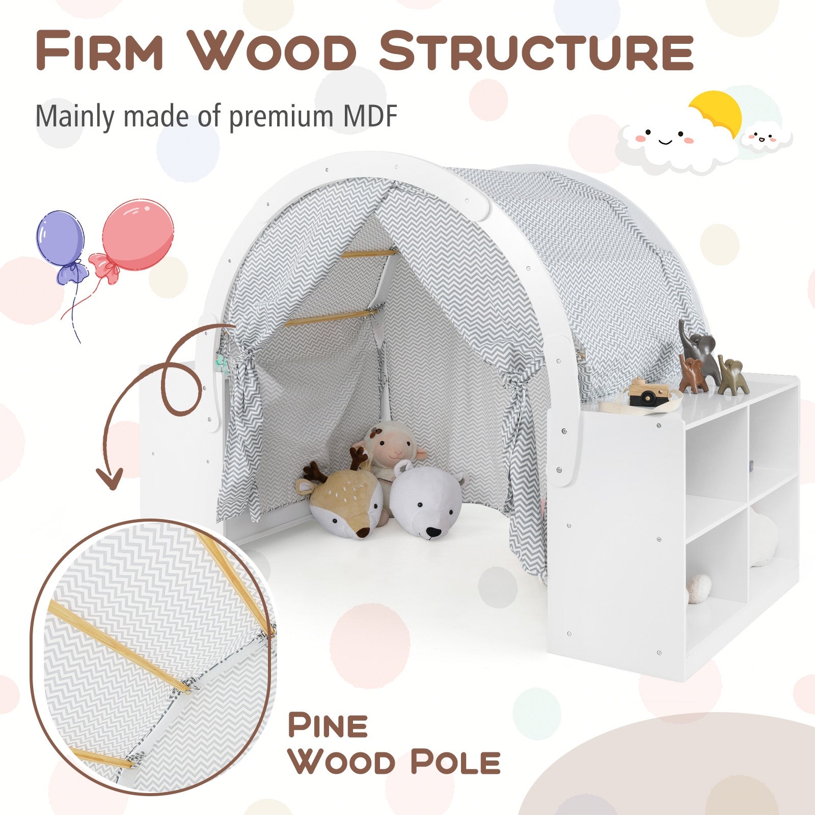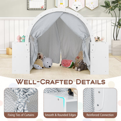 Tente de jeu pour enfants en bois avec rideaux, 8 casiers, blanc