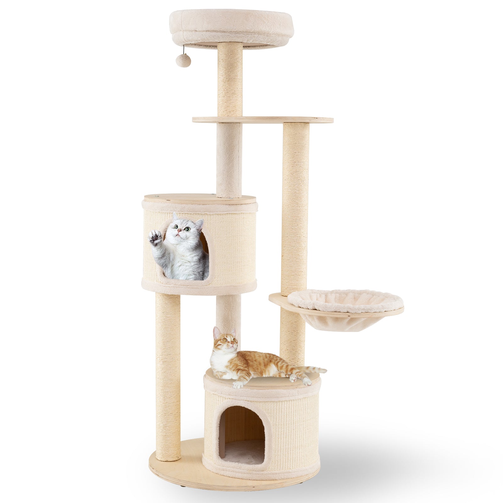 Stable and Reliable Construction: This 60"/152 cm tall wooden cat tree is constructed with a solid plywood frame, enhanced by a thickened and widened base, ensuring durability and stability. In addition, it features anti-slip foot pads for floor protection and round corners for enhanced safety.Multiple Resting Spots: The luxury cat tower includes 2 spacious cat condos at different layers for private napping, a cozy basket that gives your cat a wrapped feeling, and a large top perch with thick padding for lounging and overlooking. It is ideal for multi-cat households.