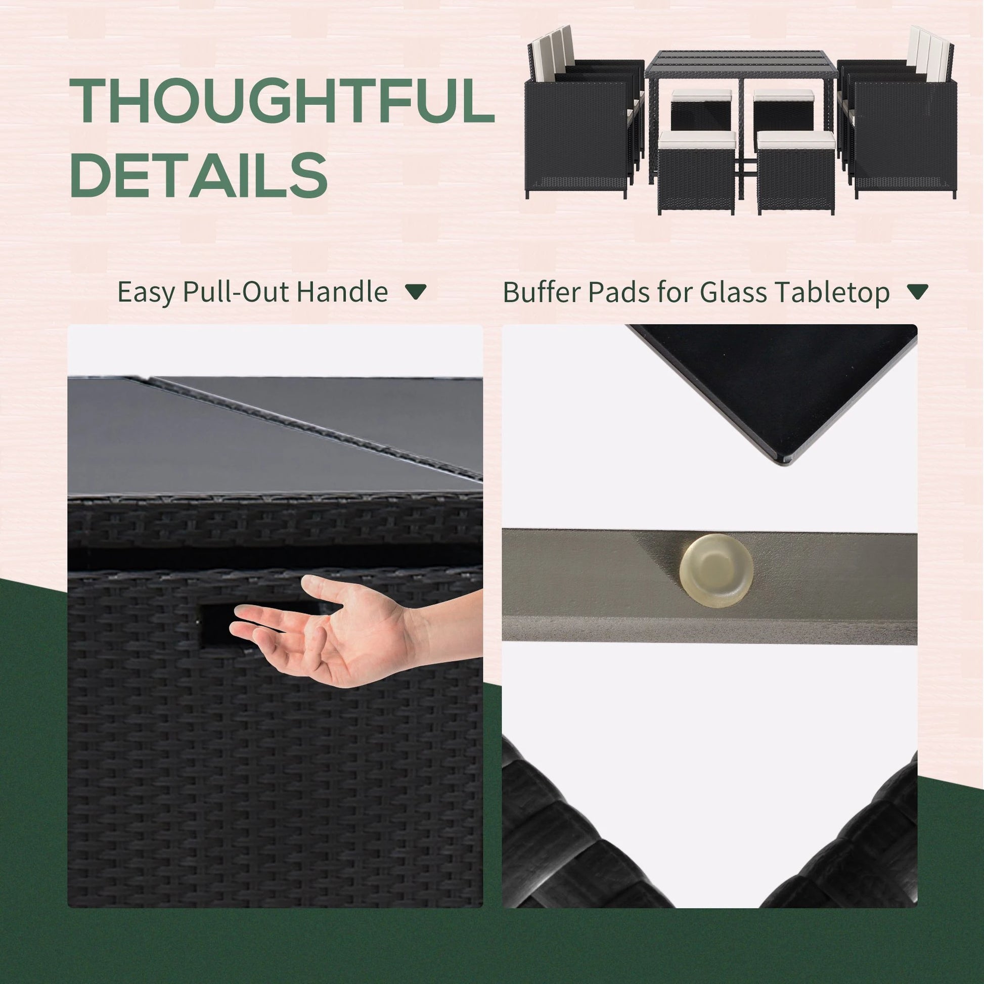 - Space-saving design with chairs and footstools that tuck under the table
