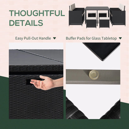 Transform your outdoor space into a cozy retreat with this elegant 11-piece outdoor dining set, perfect for family gatherings and entertaining guests. Designed for durability and comfort, it features a sturdy steel frame, all-weather PE rattan, and removable, washable cushions.