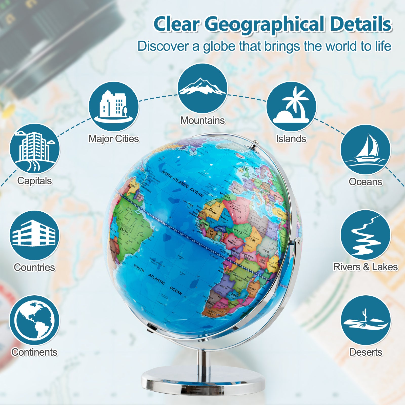 - Ideal for children and learners of all ages to explore continents, countries, capitals, and geographic features.