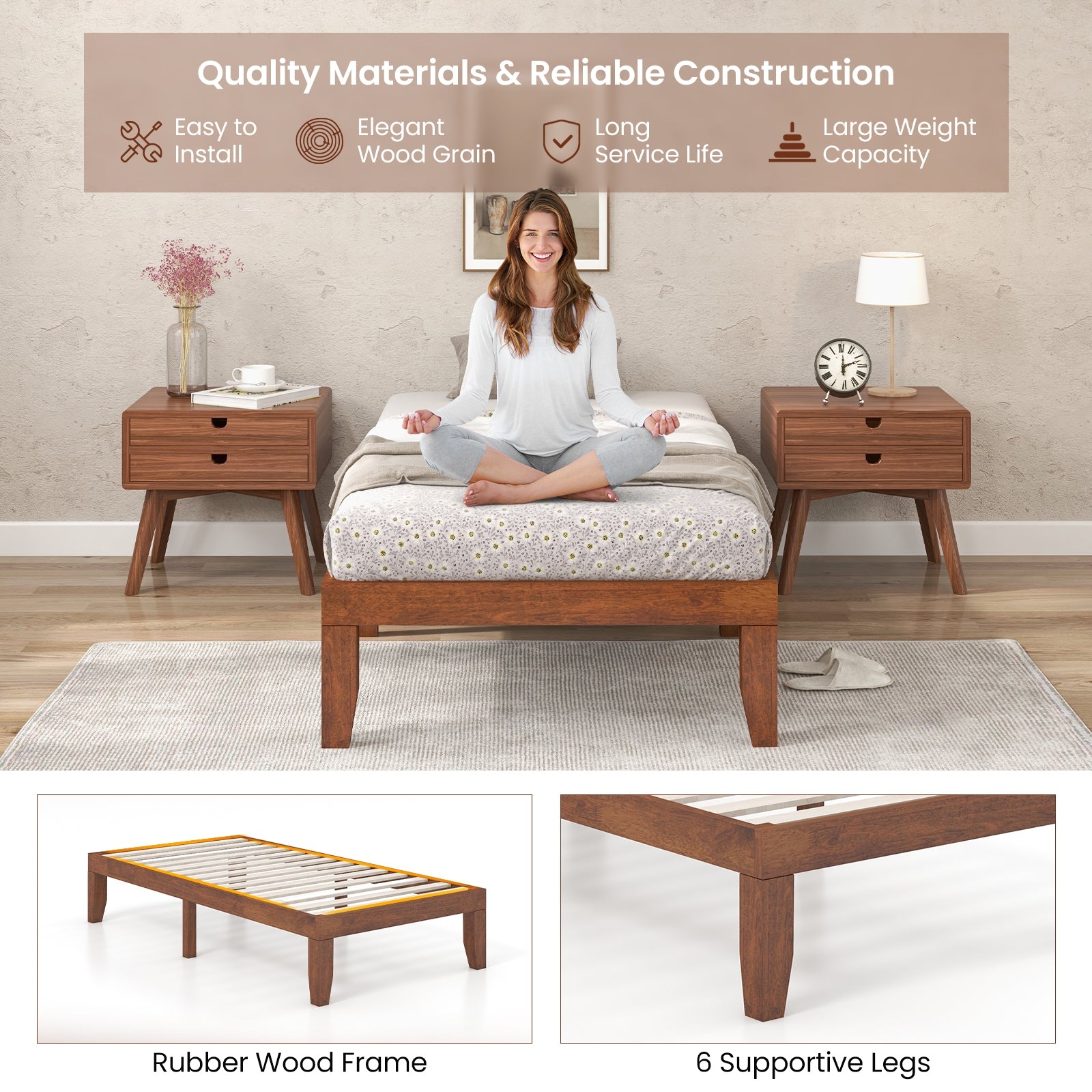 - Premium twin-size bed frame made from 100% solid rubberwood and poplar wood for superior stability and long-lasting comfort.