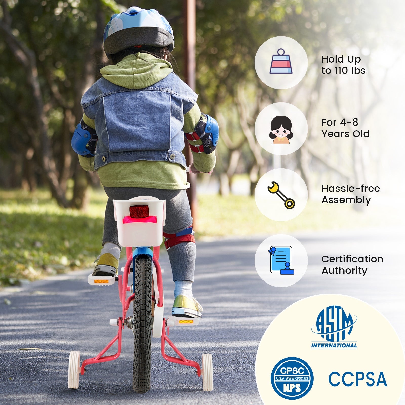Friendly to Younger Riders: Equipped with a lower profile carbon steel structure, this kid' bike is easy to ride on and pedal. The training wheels help the younger rider to master balance and prepare them for the full-sized bike while the inflating rubber wheels ensure a smooth ride. They can be removed when the kids start to find their ways. Besides, the PU seat lifts the comfort in riding. This kids bike complies with ASTM/ CPSIA/ CCPSA.