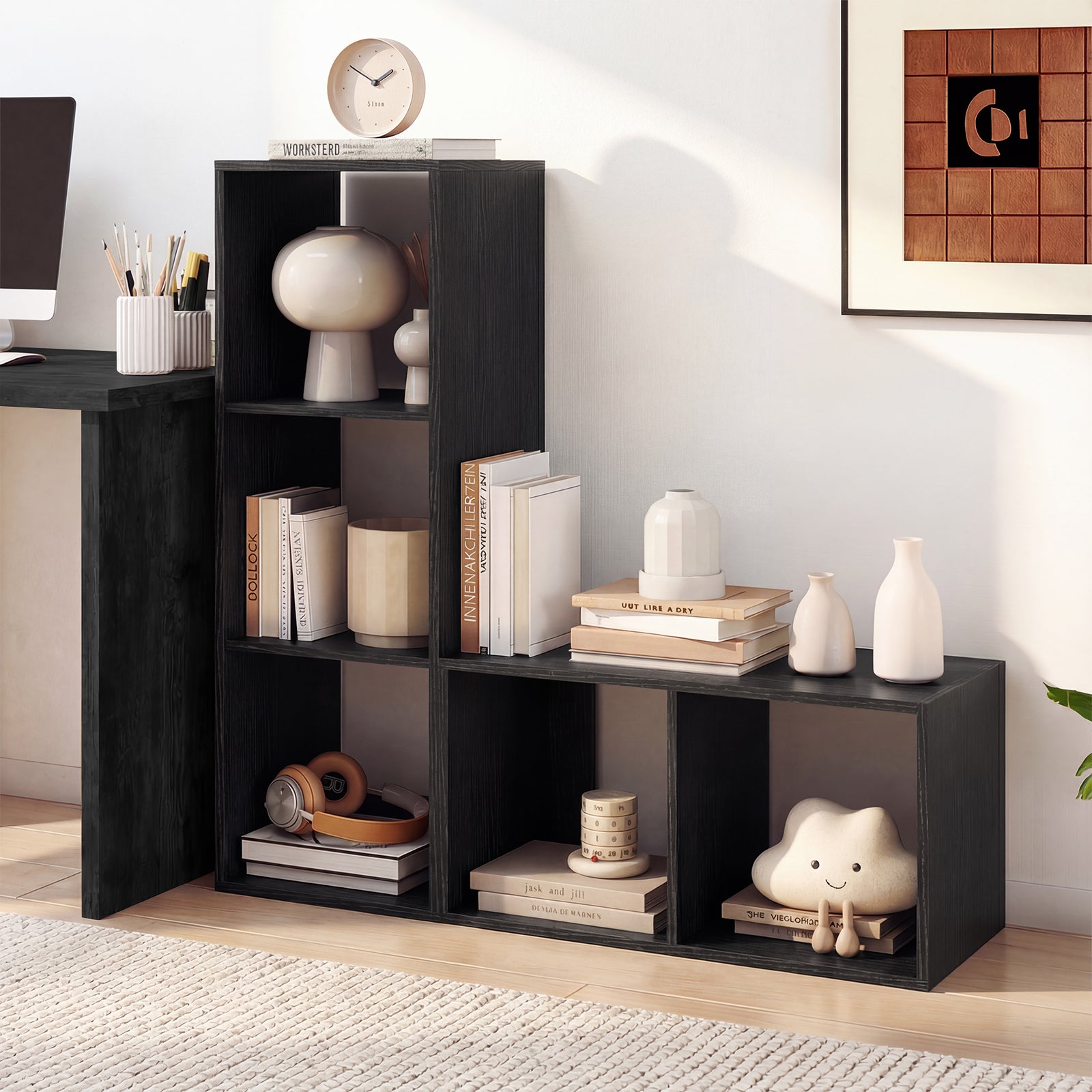 - Non-slip foot pads keep bookcase stable in place