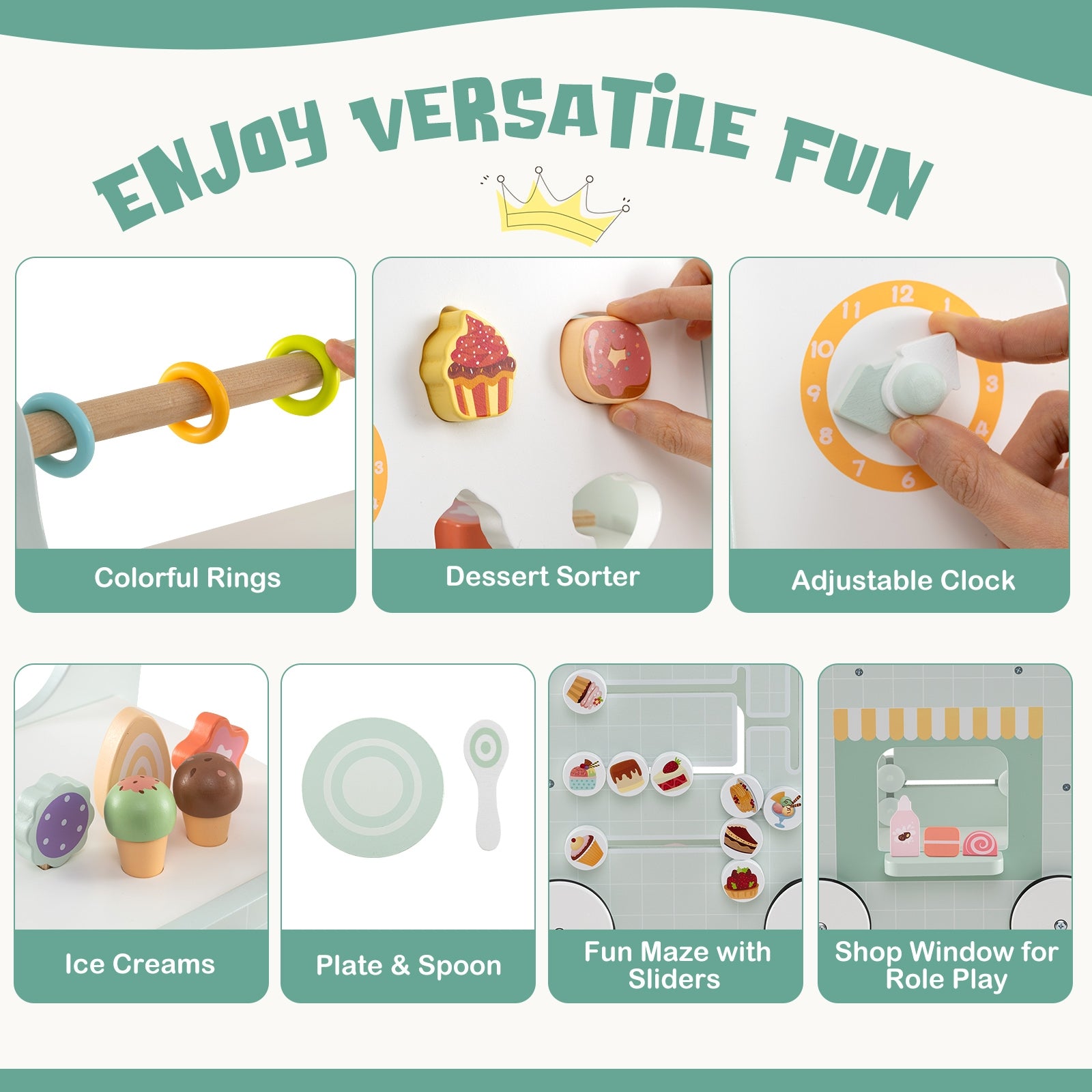 Enjoy Versatile Fun: Delight in vibrant activities with this baby walker, which features colorful rings, dessert sorter, adjustable clock, ice creams, plate and spoon and fun maze with sliders for endless amusement. Moreover, the baby activity center features a vivid shop window for role play on the side.